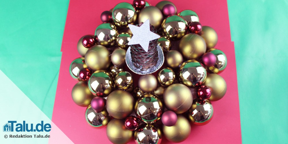 4. Schritt: Nach der Außenseite folgt nun der innere Bereich des Rohlings. Schmücken Sie ihn anschließend wiederum mit Weihnachtskugeln aus. Verwenden Sie hierfür die nächst kleinere Kugelgröße und kleben die Exemplare dazu fest.