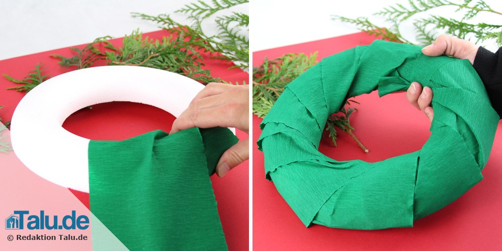 Schritt 2 – Kommen wir nun zum Rohling. Sie können einen Rohling aus Styropor oder Stroh verwenden. Entscheiden Sie sich für einen weißen Styropor-Rohling, dann sollten Sie diesen vorab mit etwas grünem Krepppapier umwickeln, damit keine unschönen weißen Stellen durch das Grün leuchten.