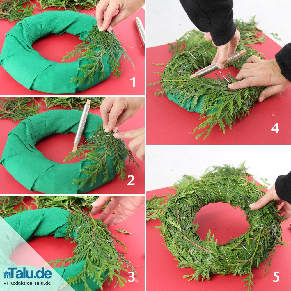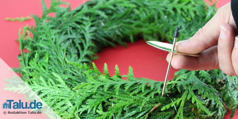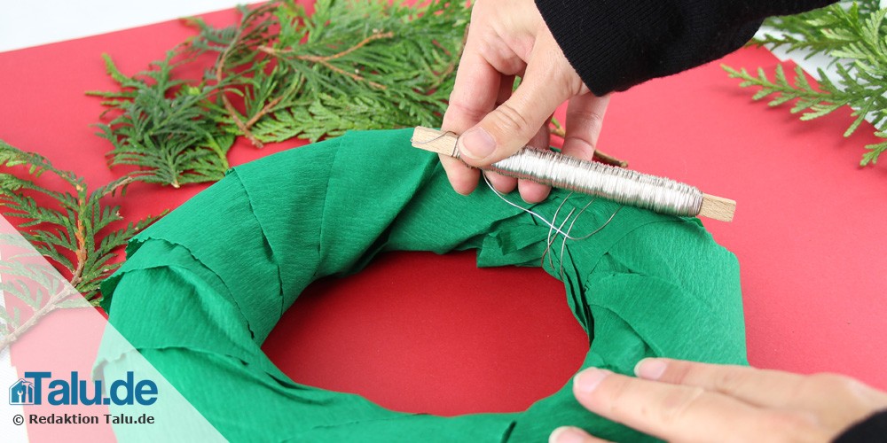 Bevor Sie die Zweige befestigen können, befestigen Sie den Draht (Bast, Band) am Rohling indem Sie ein paar Mal darum wickeln. Nun beginnen Sie mit dem Befestigen der Zweige. Die Art und Weise hängt hierbei auch etwas von der Sorte ab. Wir arbeiten mit Thuja, da diese sehr biegsam ist. Nehmen Sie einige Zweige und legen Sie diese auf den Rohling. Auch am inneren und äußeren Rand sollten sich einige Äste befinden.
