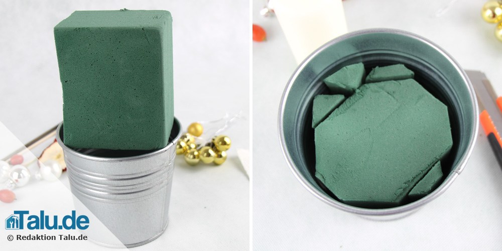 Schritt 1 – Schneiden Sie den Steckschwamm in Form, damit er in das Behältnis passt. Steckschwämme lassen sich mit einem normalen Messer ganz leicht bearbeiten.