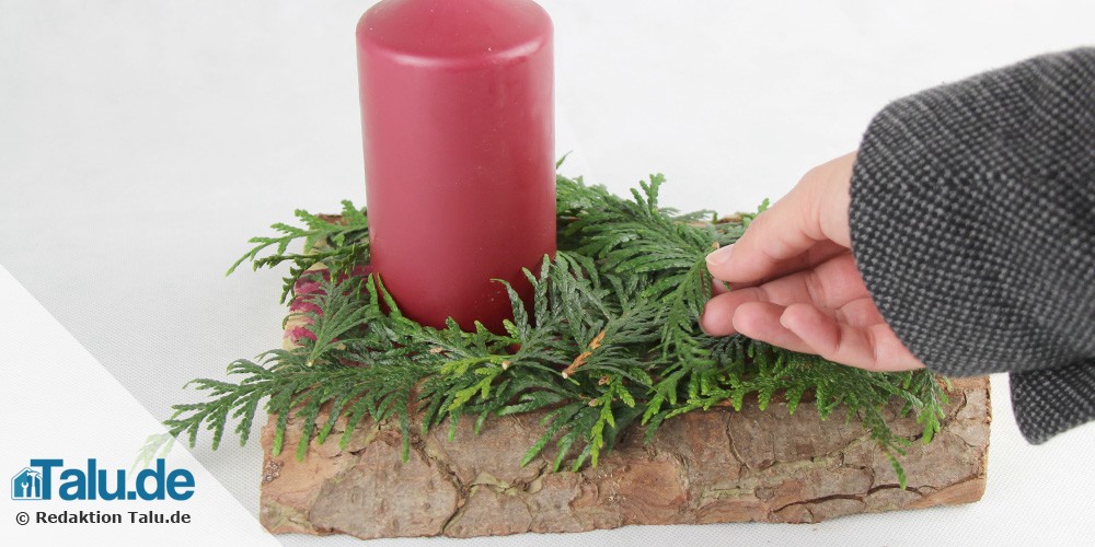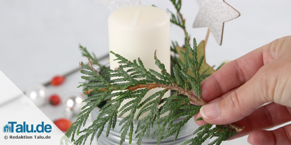Schritt 4 – Schneiden Sie nun etwas Thuja (Konifere) zurecht. Verwenden Sie auch hier nur die frischen und grünen Spitzen. Hierbei ist Ihrer Phantasie keine Grenzen gesetzt. Wir haben die Zweige hinter der Kerze angeordnet, da im vorderen Teil noch etwas Deko zu sehen sein soll.