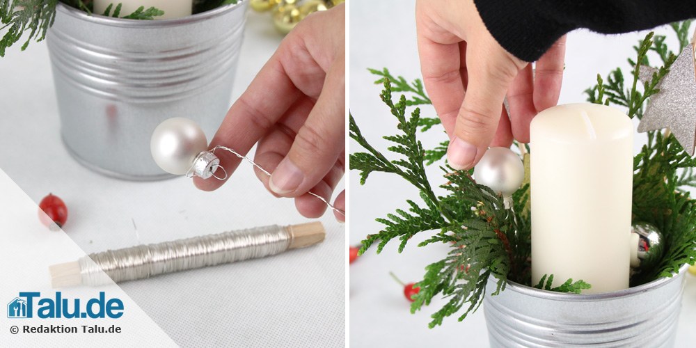 Schritt 5 – Bei der restlichen Dekoration haben wir alte kleine Kugeln mit einem Draht versehen und diese im Gesteck platziert. Stattdessen können Sie hier auch Zapfen, Hagebutten oder Nüsse verwenden.