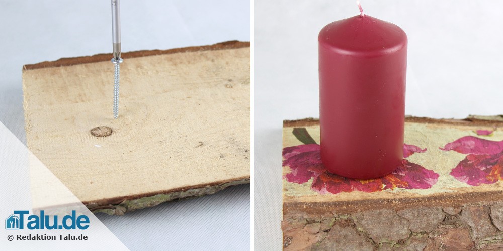 Schritt 2 – Drehen Sie eine passende Schraube durch das Loch. Anschließend drehen Sie die Stumpenkerze auf die Schraube, sodass sie sicher und stabil hält.