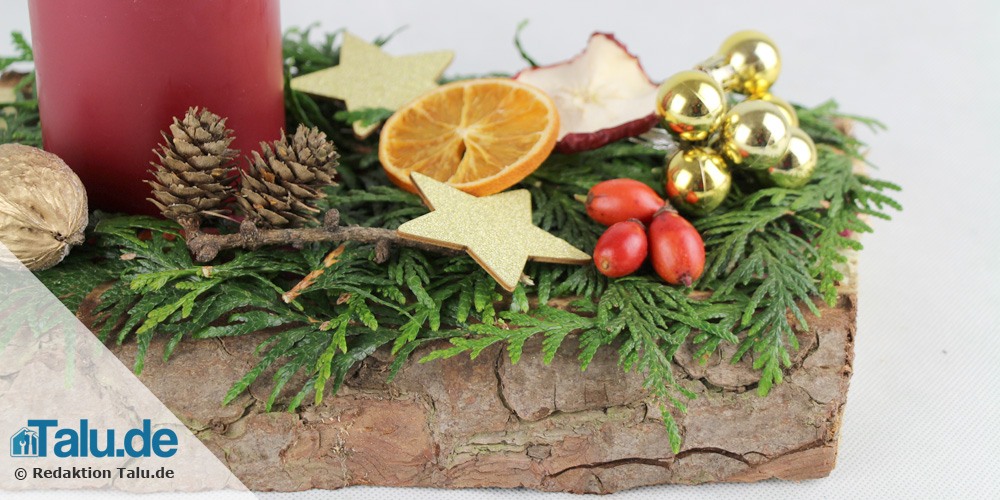 Schritt 5 – Nun geht es ans Dekorieren. Hierfür stehen Ihnen die unterschiedlichsten Utensilien zur Wahl. Wie wäre es etwa mit Kastanien und Tannenzapfen? Oder bevorzugen Sie getrocknete Früchte? Auch eine Kombination der genannten Elemente kommt infrage, vor allem, wenn Sie ein relativ großes Adventsgesteck basteln. Weitere Optionen sind: