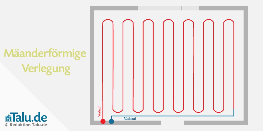 Die mäanderförmige Verlegeart führt zu einer ungleichmäßigen Oberflächentemperatur im Raum. Es existieren Bereiche, welche daher besonders stark erwärmt werden, und Bereiche, die kühler bleiben. Die Vorgehensweise wird meistens für kleine Räume oder im Randbereich genutzt. Der Begriff „Mäander“ entstammt aus dem Bereich der Flüsse. Er bezeichnet eine Fluss-Schlinge in einer Abfolge aus mehreren Fluss-Schlingen. Die mäanderförmige Verlegung basiert auf der wechselweisen Anordnung der Rohre in parallelen Linien. Im Bereich des Vorlaufs ist die Wärmeleistung am größten. Ist der benötigte Heizbedarf im Raum nur gering oder handelt es sich um einen kleinen Raum, so gleicht sich die ungleiche Wärmeverteilung wieder aus beziehungsweise die stattfindenden Wärmeverluste relativieren die Auswirkungen.