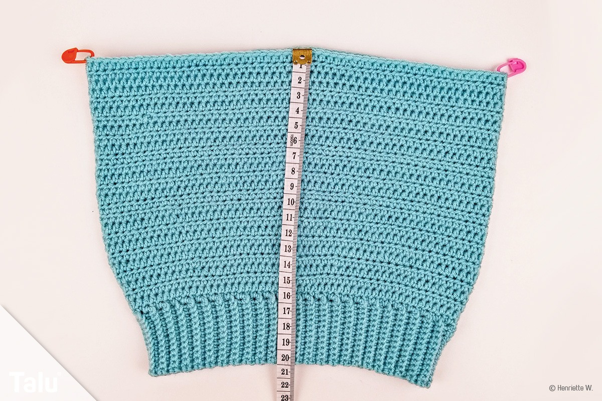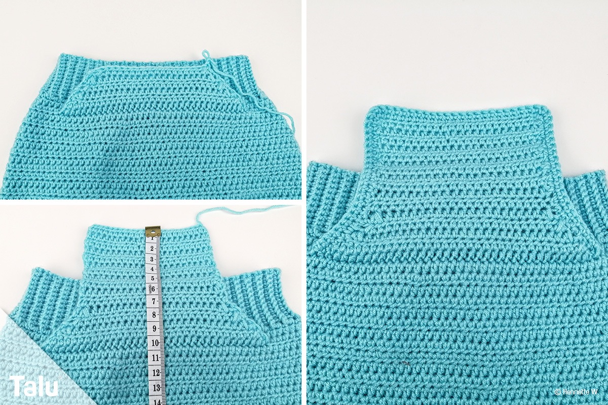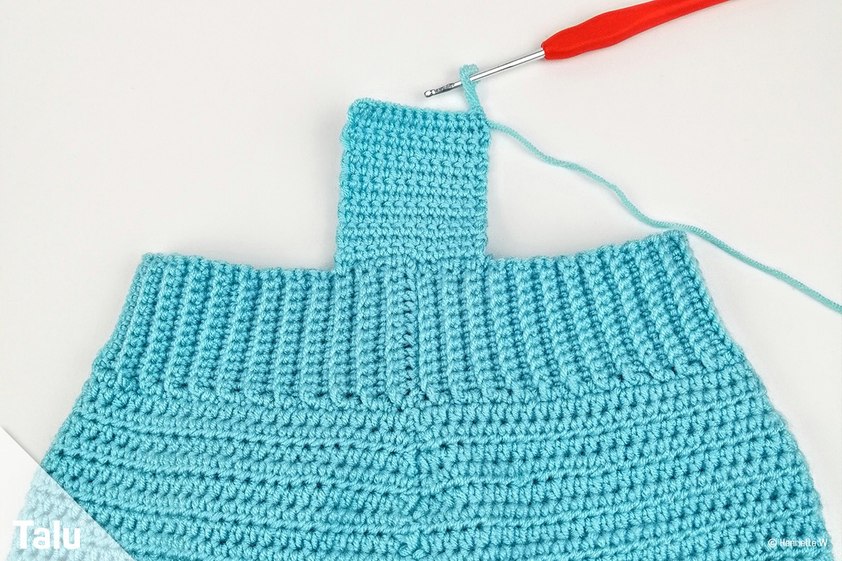 Bestimmen Sie wieder die Mitte des Hinterteils der Hose und häkeln Sie dort mittig 12 feste Maschen an. Arbeiten Sie nun 6 cm hoch. Jede Reihe endet mit einer Steigeluftmasche.