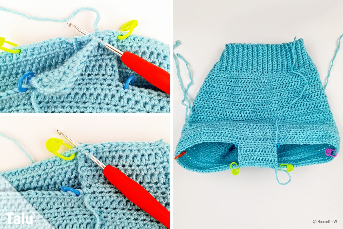 Für die Beinchen müssen am Schritt Maschen abgenommen werden. Dazu beginnen Sie in der Mitte des Schritts. Bis zum Anfangsfaden die ganze Runde (Schritt und Beinchen) mit halben Stäbchen häkeln. Die Runde endet wie gehabt mit einer Kettmasche.