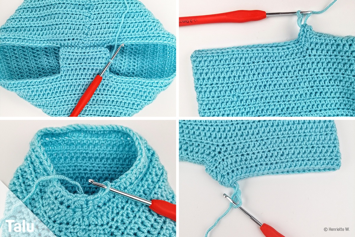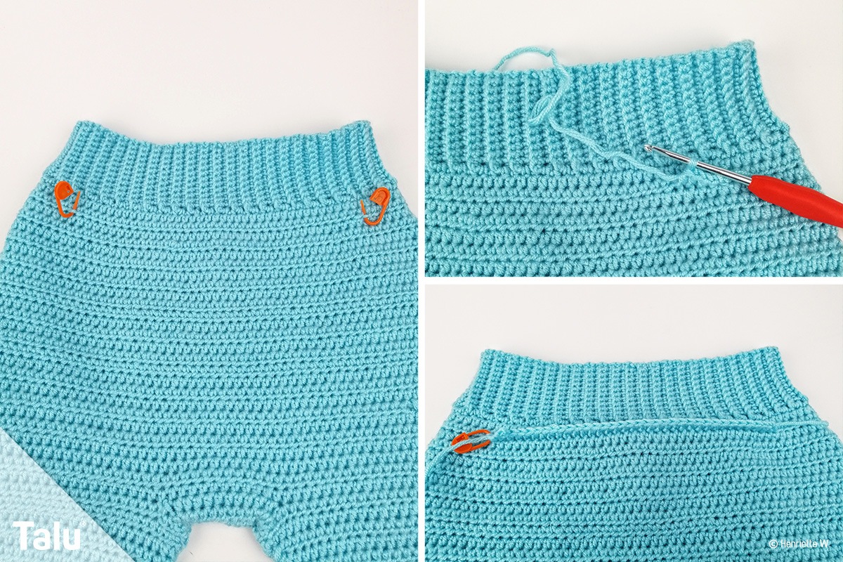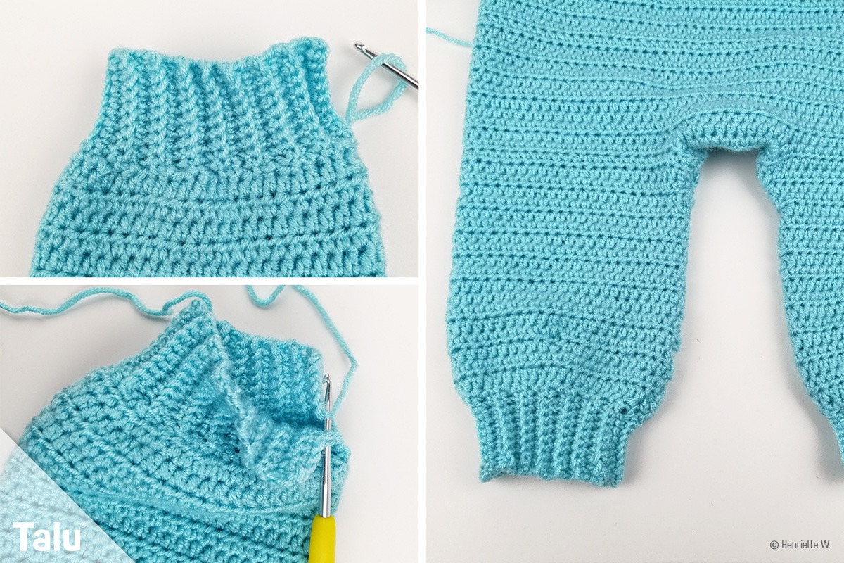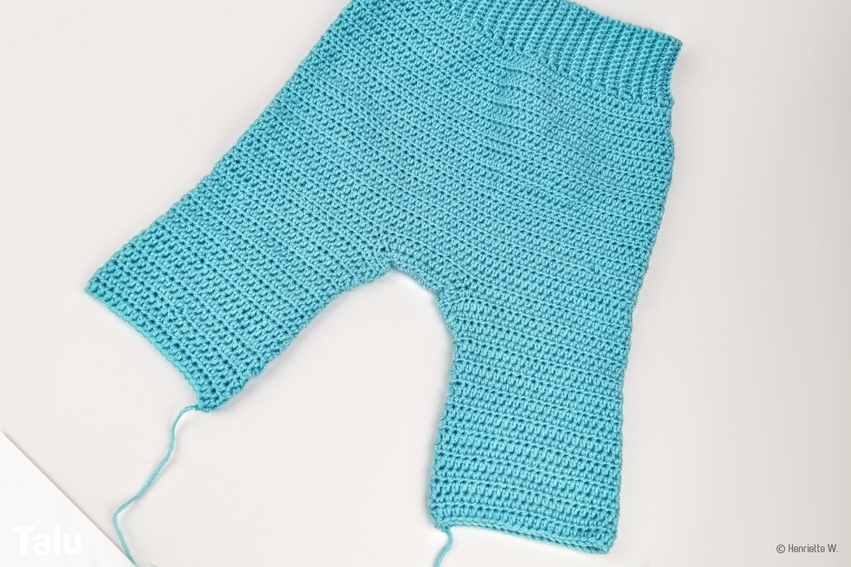 Nehmen Sie nun Maschen aus dem Querfaden der Hose auf und häkeln Sie die gesamte Breite mit halben Stäbchen.