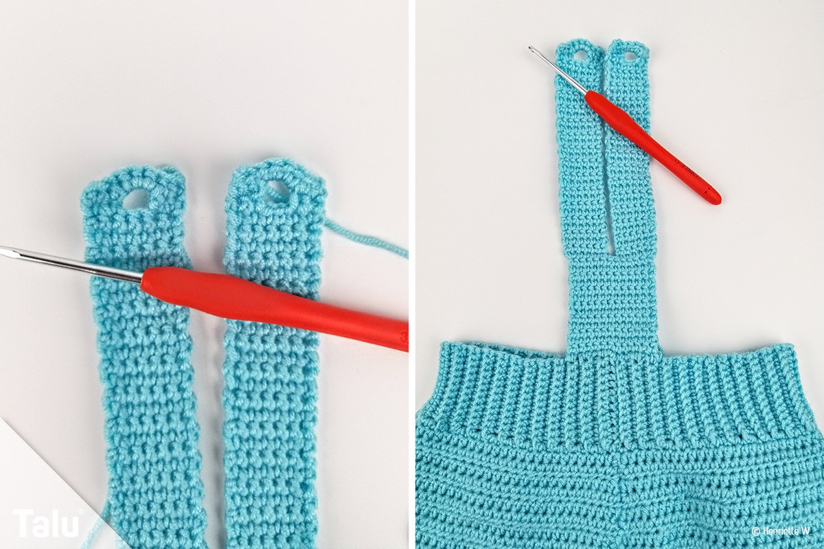 Jeder Latz braucht auch seine Träger. Die Latzträger haben wir mit festen Maschen gehäkelt. Dazu haben wir am Rückenteil der Hose einen breiteren Träger aus 12 festen Maschen gehäkelt, der sich dann in zwei schmale Träger teilt.