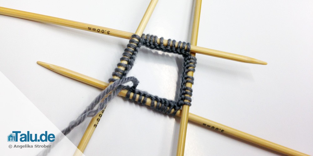 Es werden 40 Maschen in Farbe 1 (grau) angeschlagen und gleichmäßig zu je 10 Maschen auf vier Nadeln verteilt.