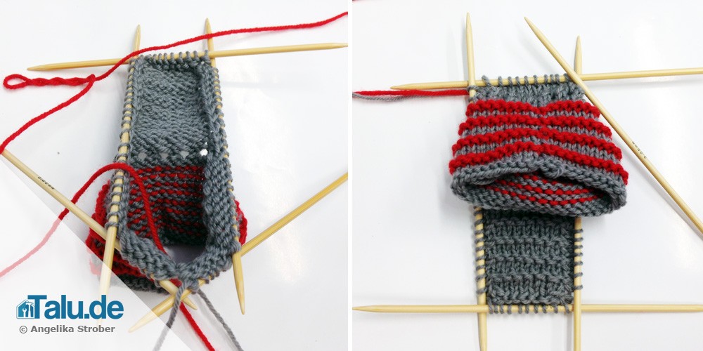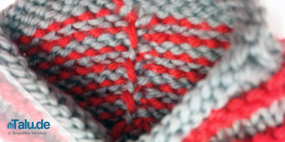 - dabei an der Spitze des Fußblattes 2. + 3. Masche überzogen zusammenstricken und die 8. und 9. Masche rechts zusammenstricken