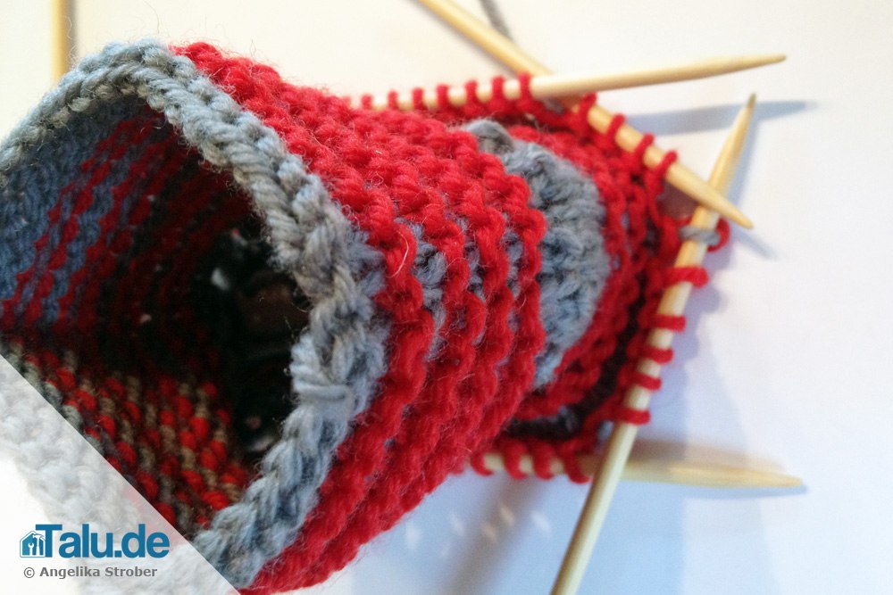 Die Sohle durchweg in glatt rechts mit grau stricken.