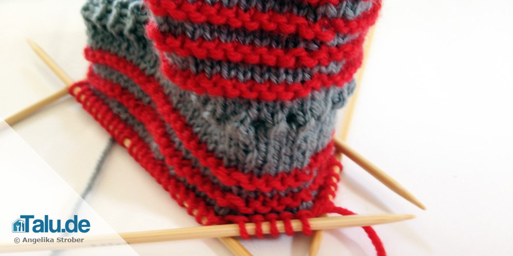 - wieder in Runden weiterstricken und dazu entlang des Fußblattes je 13 Maschen aufnehmen