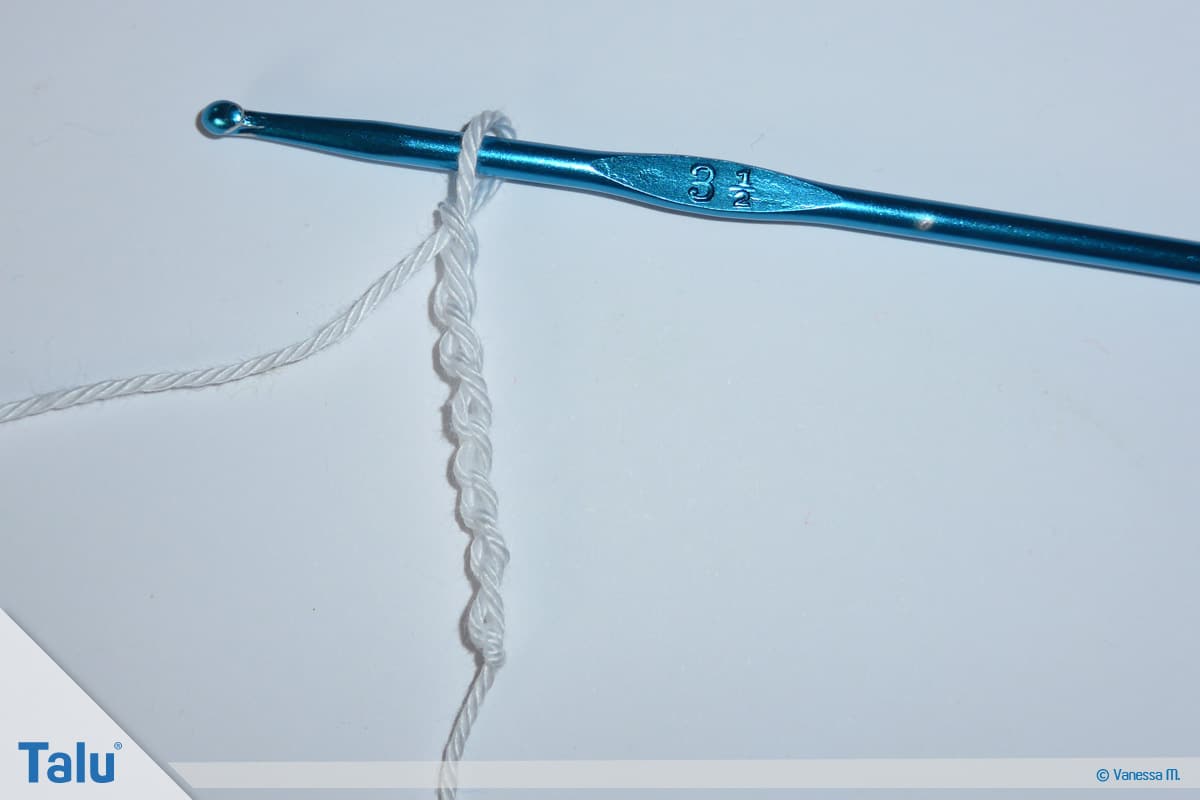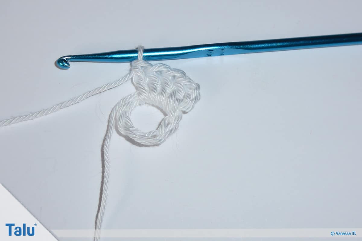 Nehmen Sie das Häkelgarn in der ersten Farbe zur Hand (bei uns: Weiß). Häkeln Sie 8 Luftmaschen und schließen diese mit einer Kettmasche zu einem Ring.
