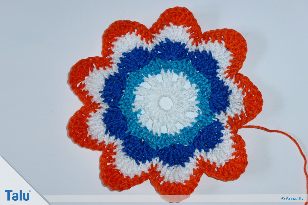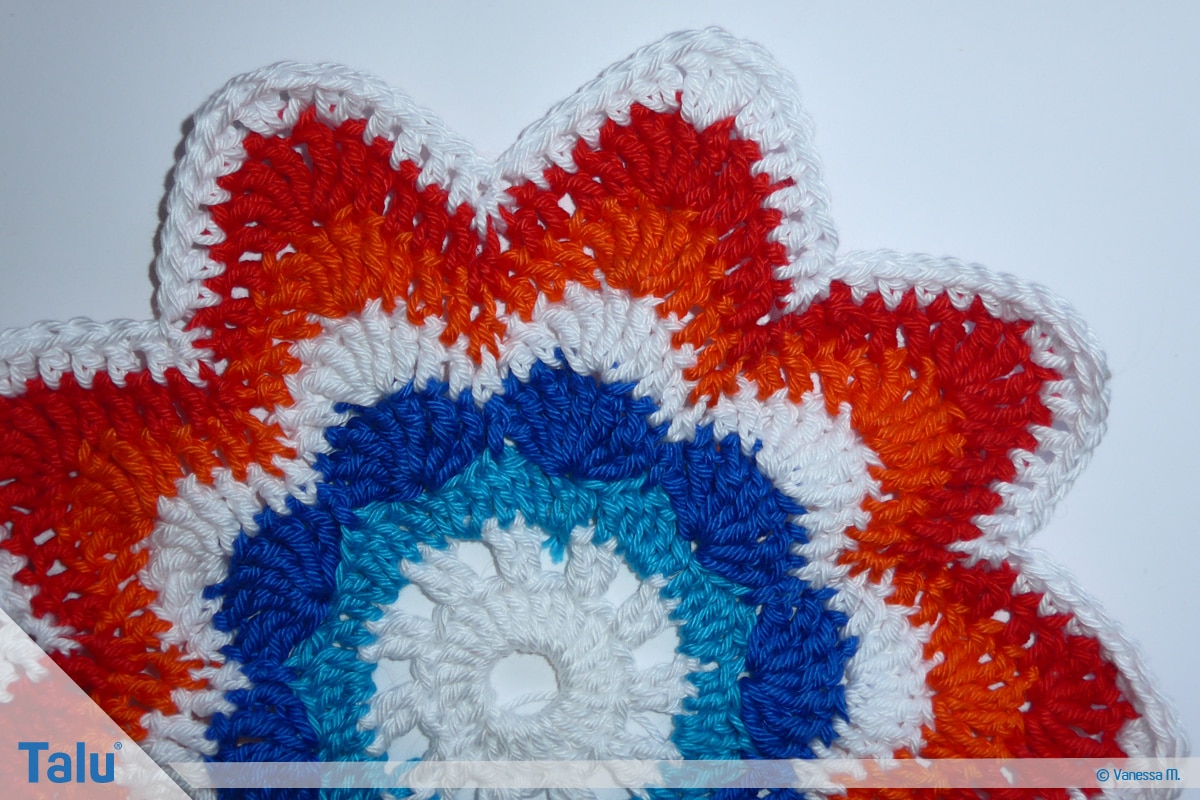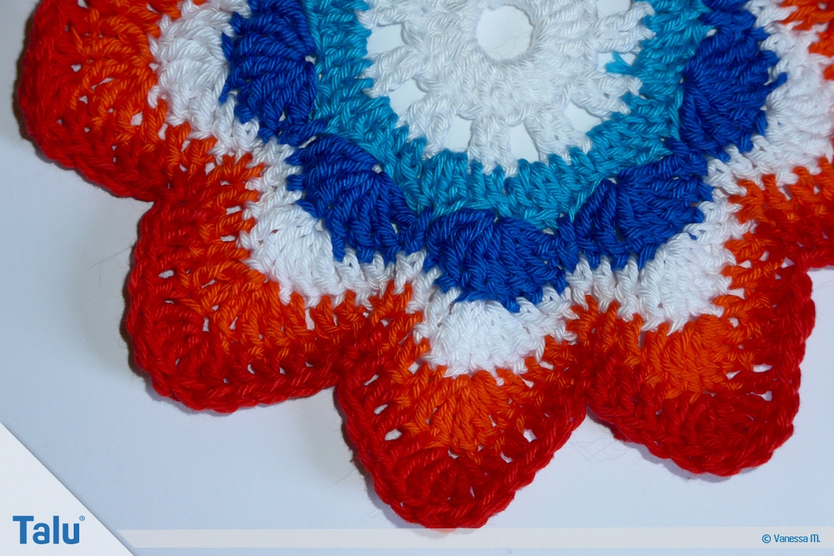 In der nächsten Farbe (bei uns: Rot) häkeln Sie die 7. Runde. Sie hat das gleiche Schema wie die 6. Runde. Der einzige Unterschied besteht darin, dass Sie auf den Bogenseiten jeweils 4 Stäbchen häkeln. Beenden Sie die Runden immer mit dem Zusammenfassen der 3 Maschen zu einer festen Masche.