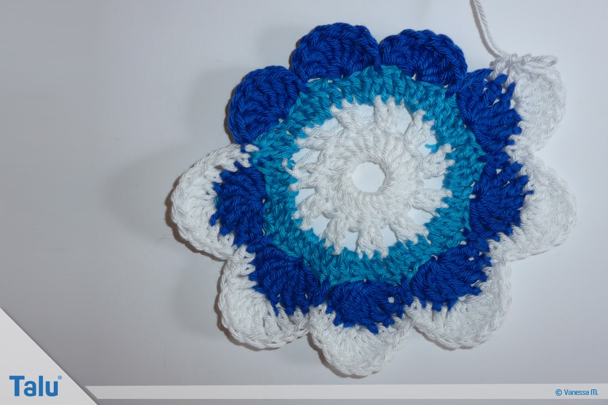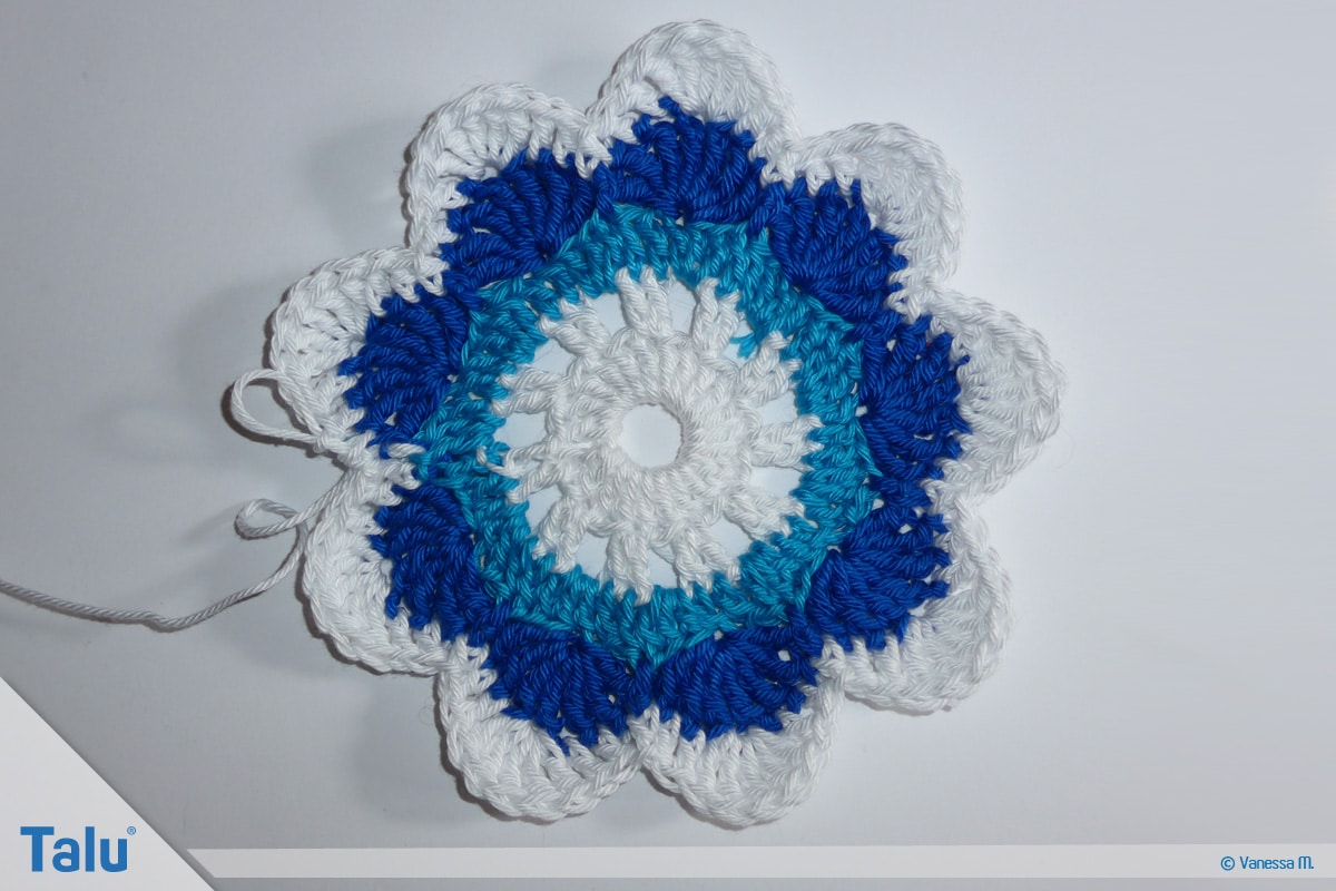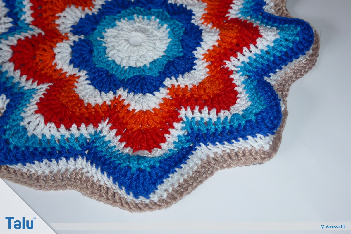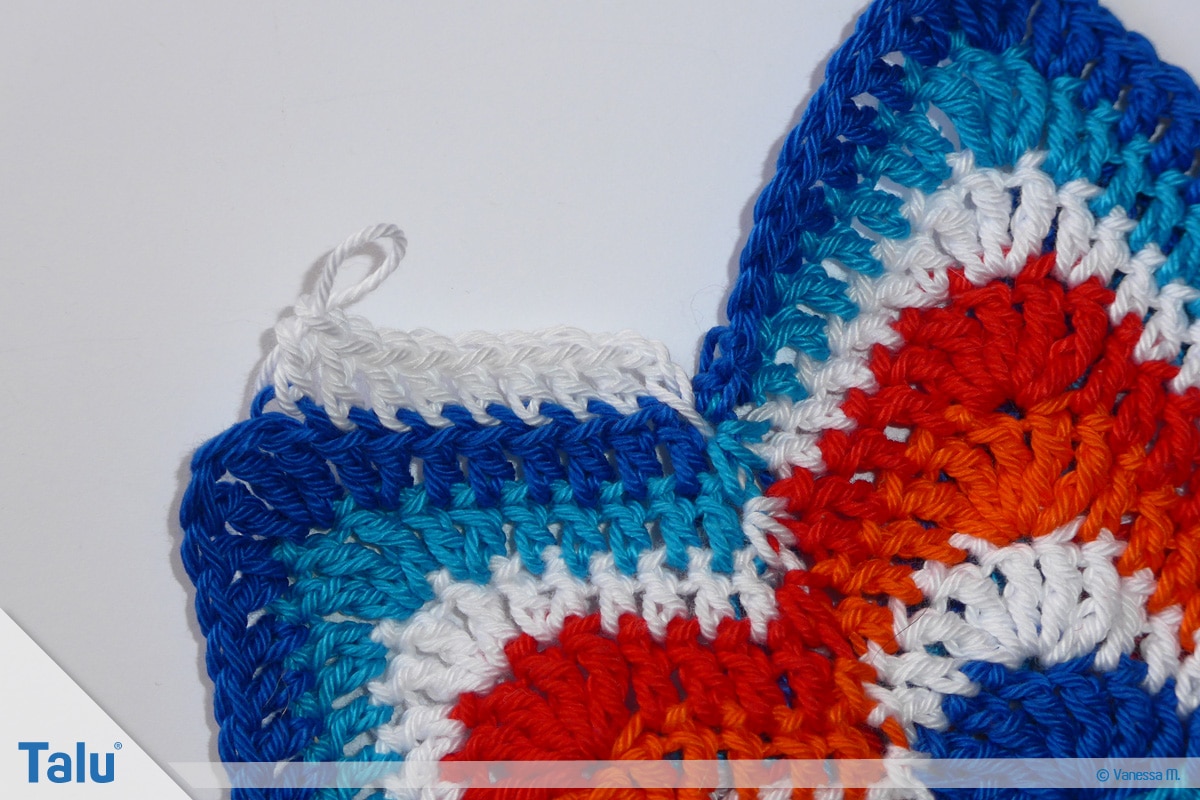 In der nächsten Farbe (bei uns: Rot) häkeln Sie die 7. Runde. Sie hat das gleiche Schema wie die 6. Runde. Der einzige Unterschied besteht darin, dass Sie auf den Bogenseiten jeweils 4 Stäbchen häkeln. Beenden Sie die Runden immer mit dem Zusammenfassen der 3 Maschen zu einer festen Masche.