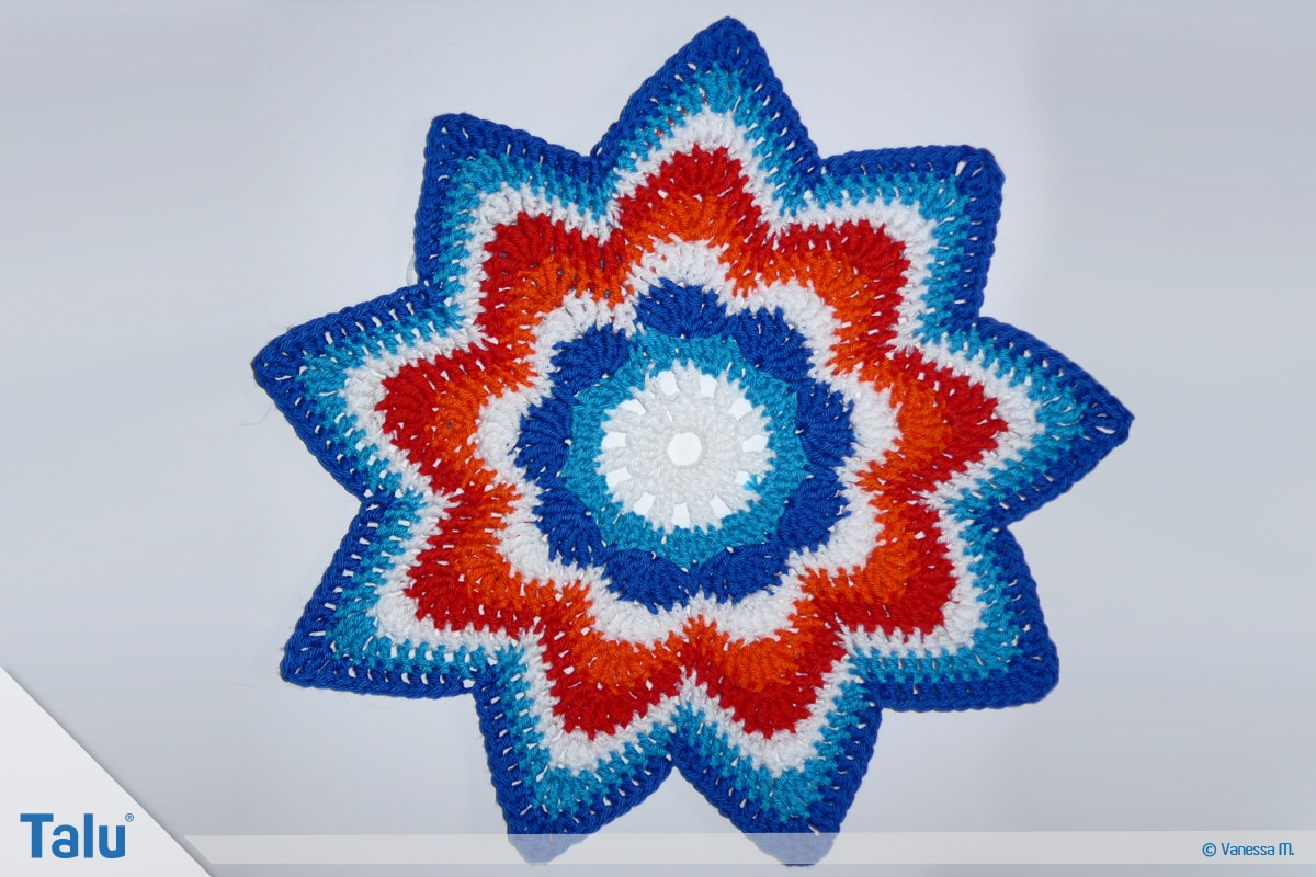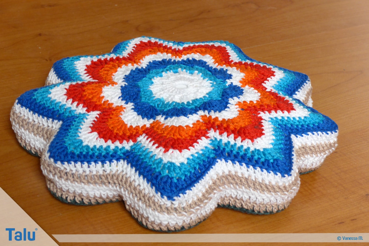 Nach dem Schema der 8. Runde können Sie nun nahezu beliebig viele weitere Runden häkeln. Es ändert sich immer nur die Anzahl der einzelnen Stäbchen auf beiden Seiten des Bogens um 1. So sind es in der 9. Runde 4 Mal ein Stäbchen pro Masche, in der 10. Runde 5 usw. Der Bogen wird so immer spitzer. Daher erhält das Häkelkissen mit weniger Runden eher eine Blumenform und mit vielen Runden eher eine Sternform. Wir haben für unser Banju Kissen insgesamt 10 Runden gehäkelt.