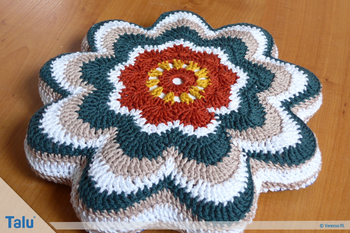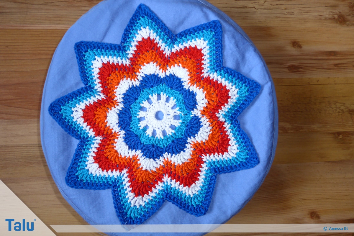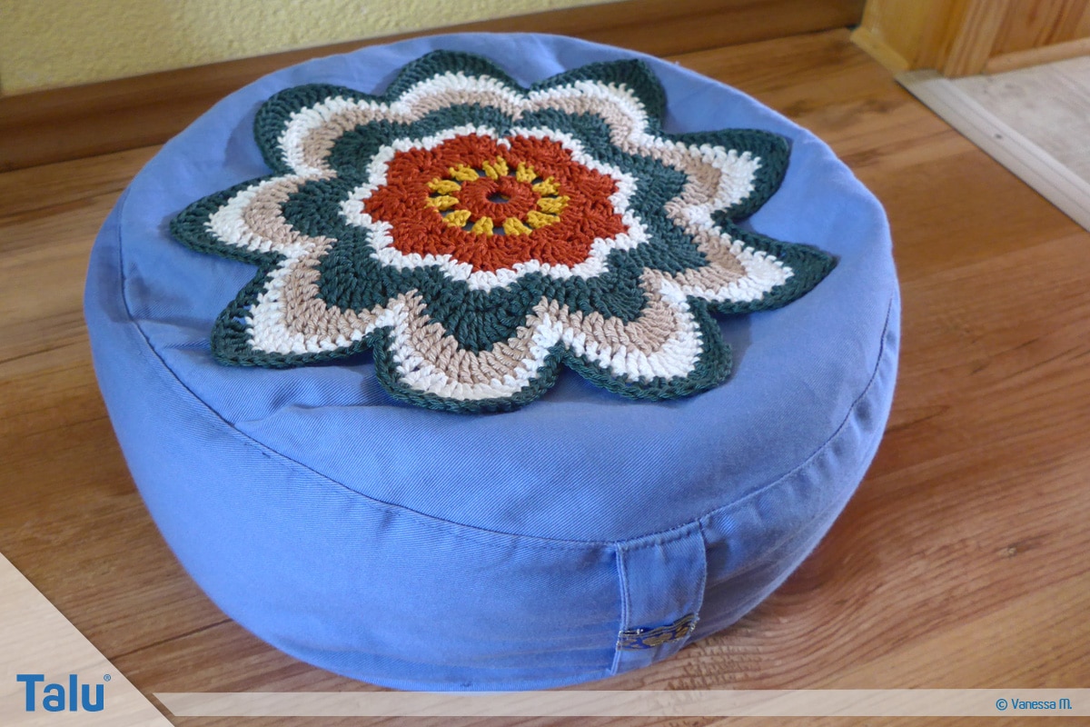 Nun haben Sie die Wahl: Entweder nehmen Sie Ihr fertiges Häkelstück und nähen es auf ein rundes Kissen auf oder sie häkeln eine zweite Seite und nähen sich Ihr eigenes Banju Kissen. Sollten Sie sich für die zweite Variante entscheiden, müssen Sie am Ende noch die Seite vom Häkelkissen machen.