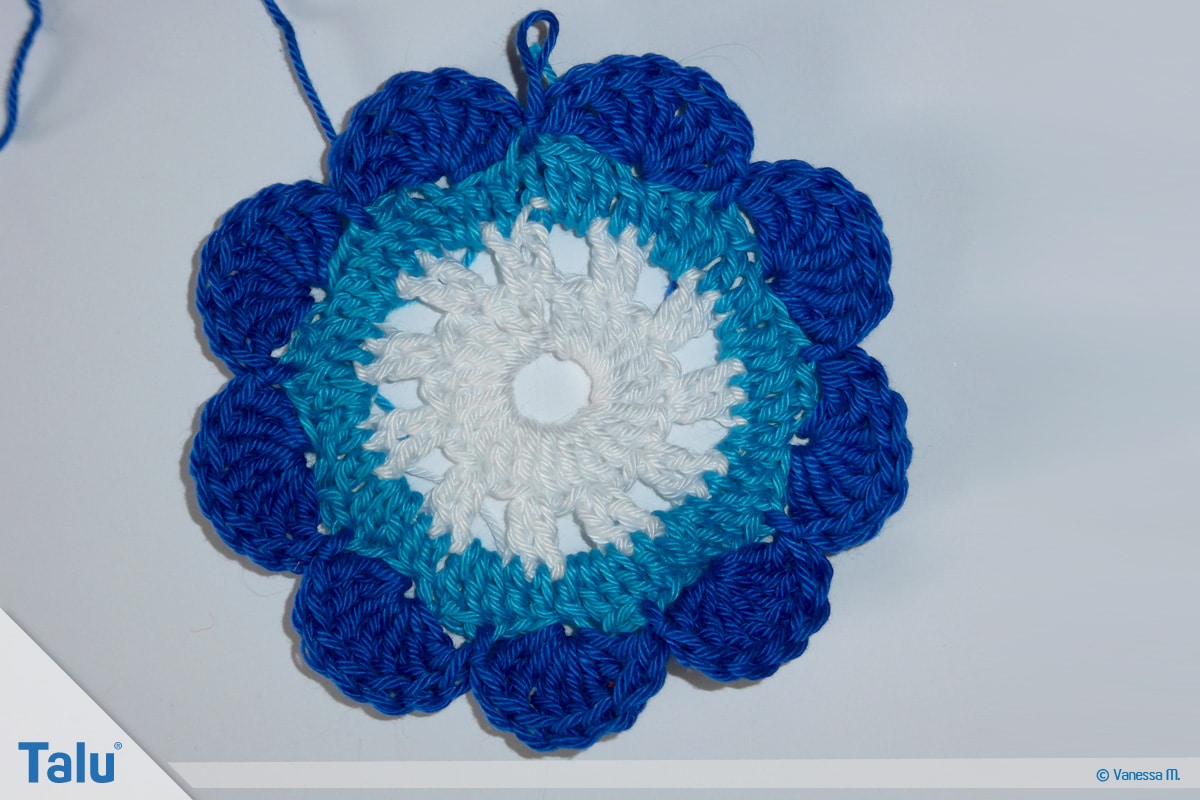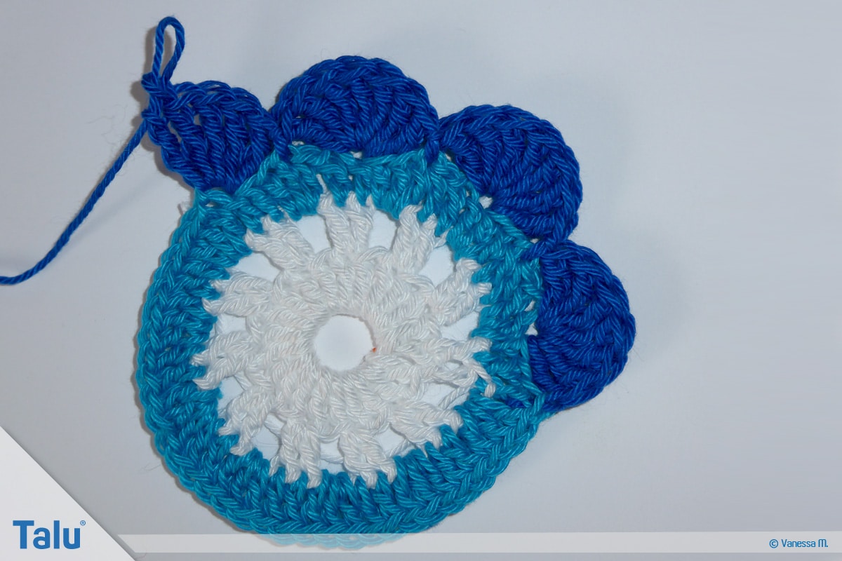 Häkeln Sie in der nächsten Farbe (bei uns: Dunkelblau) insgesamt 7 doppelte Stäbchen in die dritte Masche der Vorrunde. Spannen Sie den Bogen auf, indem Sie eine Kettmasche in die sechste Masche der Vorrunde arbeiten.