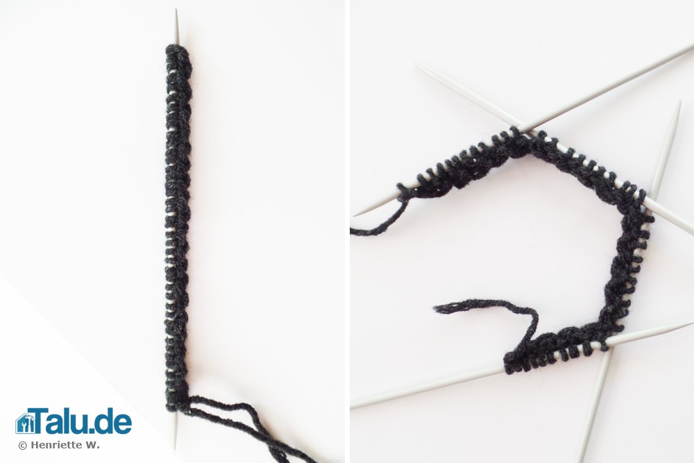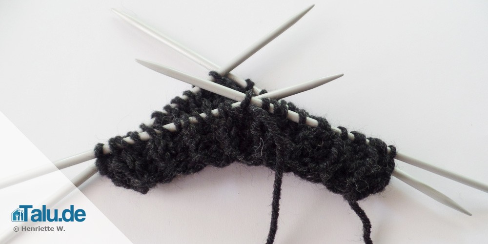 Schließen Sie nun die Maschen des Nadelspiels, indem Sie von der ersten Nadel noch zwei Maschen auf die vierte Nadel stricken. Diese zwei Maschen holen Sie sich nach drei oder vier Runden wieder auf die erste Nadel zurück. So entsteht zwischen der ersten und vierten Nadel keine große Maschenlücke, die in den ersten Runden unschön aussieht.