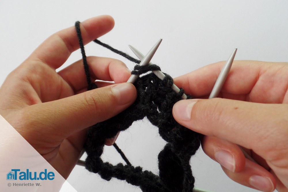 Wenn die Nadel mit einer rechten Masche beginnt, stricken Sie diese rechts ab und die nächste Masche stricken Sie links ab. Nun ziehen Sie die als erste gestrickte Masche über die zweite Masche und lassen Sie den Überzug einfach von der Nadel gleiten.