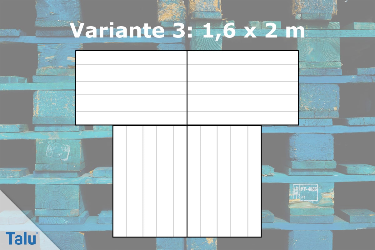 Bei dieser Variante benötigen Sie 6 Paletten pro Lage. Zwei davon muss man zwar zersägen, aber nichts braucht weggeworfen zu werden.
