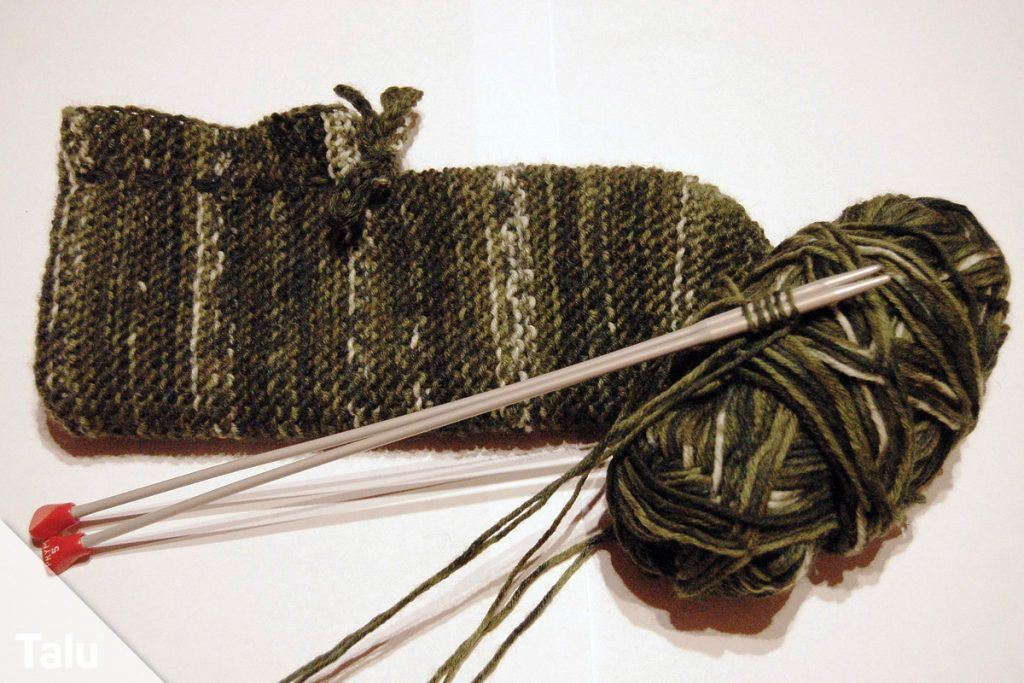 3. Beidseitig je fünf Maschen abketten. Kraus rechts weiterstricken, bis das Gestrick bis knapp vor das Ende der Zehen reicht.