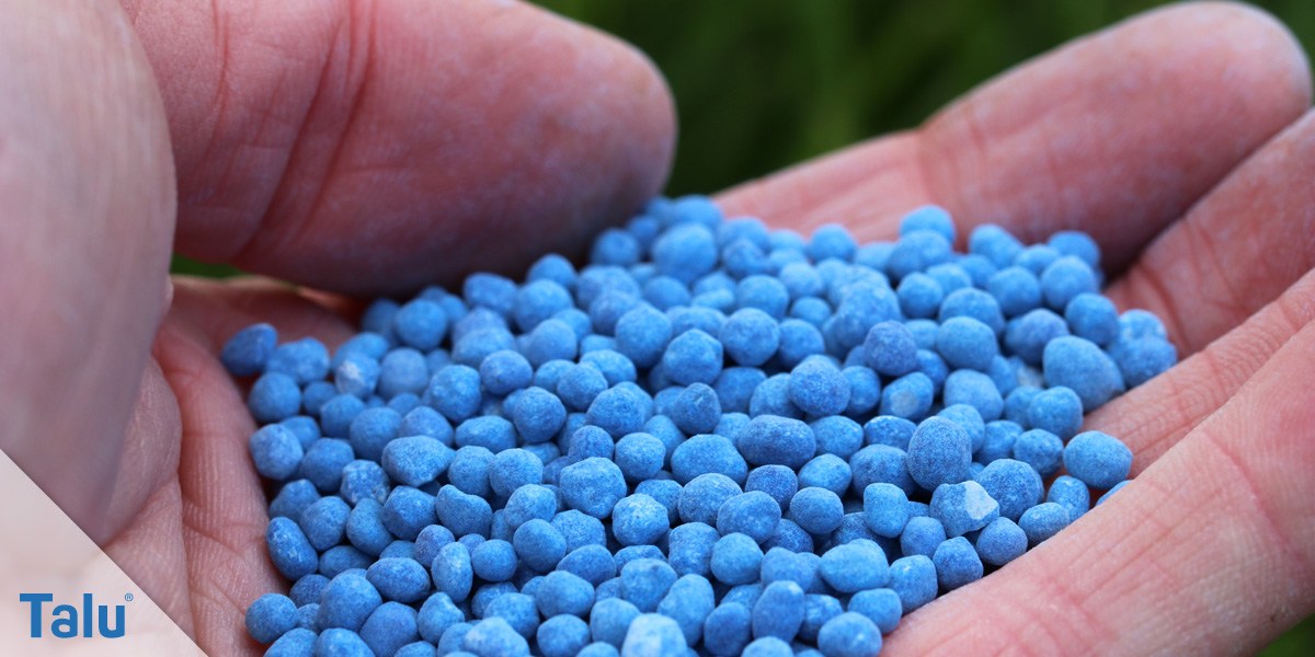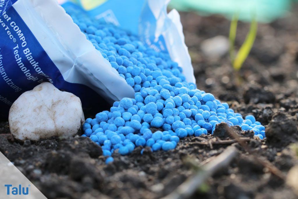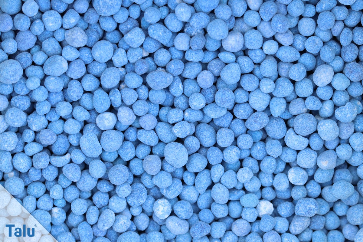 Meist reichen wenige Kügelchen des Düngers. Wichtig ist, die blauen Granulatkörner nicht zu nah am Stamm auszubringen, damit dieser und die darunterliegenden Wurzeln nicht verbrannt werden. Ideal ist, wenn die Erde feucht ist. Auch im Anschluss reichlich wässern, damit sich das Blaukorn auflösen kann.