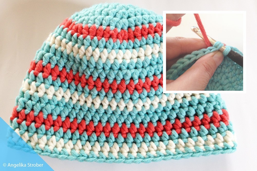 Tipp: Farbwechsel: Beim Farbwechsel häkle ich die Kettmasche schon mit der neuen Farbe. Damit es bei einer bunt gestreiften Mütze am Ende nicht Unmengen an Fäden zu vernähen gibt, ziehe ich die Fadenende im Inneren der Mütze soweit wie möglich mit. Wenn bei jeder Häkelreihe die Fäden gekreuzt werden, entsteht auch kein loser Fadensalat. Wer sich dennoch an der Fadenkette stört, die im Mützeninneren von oben nach unten verläuft, kann natürlich die Fäden jeweils beim Farbwechsel abschneiden, verknoten und gut vernähen.