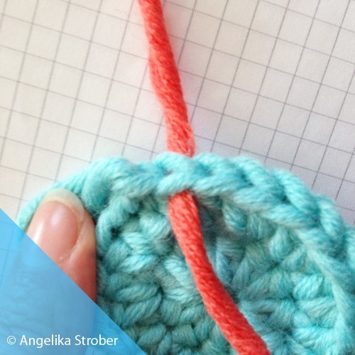 Der Rundenanfang ist eine Luftmasche und als erstes eingestochen wird in das erste halbe Stäbchen der Runde davor.
