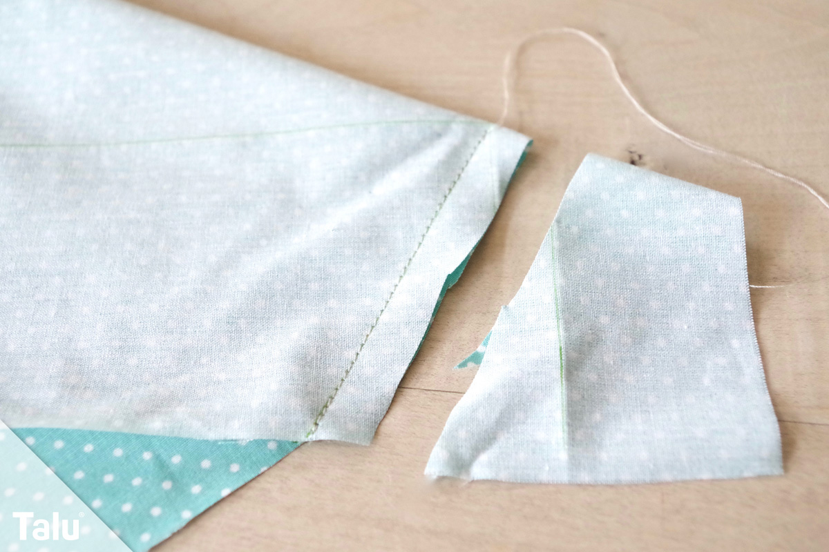 5. Schritt: Wie bei dem ersten Teil der Anleitung schneiden wir auch hier ca. 5 mm entlang der abgesteppten Linie den überschüssigen Stoff ab und wenden die Ecke auf rechts. Damit die Ecke schön aussieht, kann man mit einem Stift oder einer Nadel von innen in die Ecke stupsen.