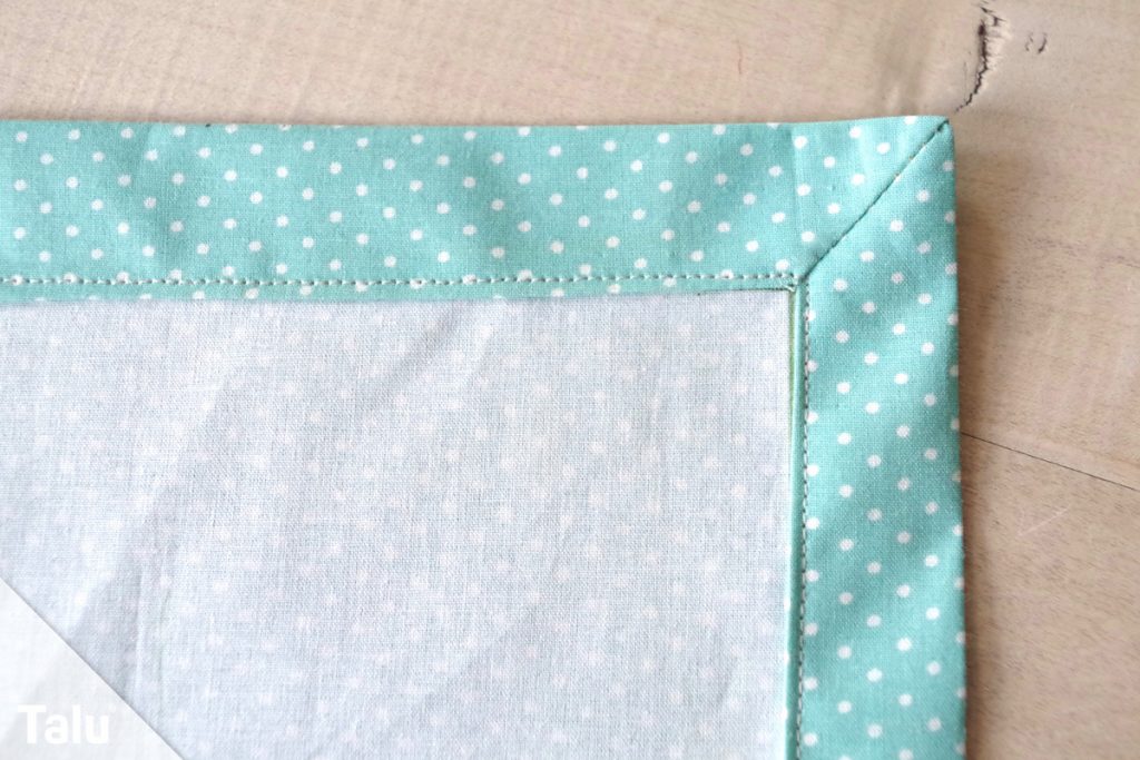 6. Schritt: Und auch hier wird mit dem Geradstich knappkantig entlang der Saumkanten abgesteppt. Wer möchte, kann auch entlang der Naht in der Ecke noch einmal absteppen.