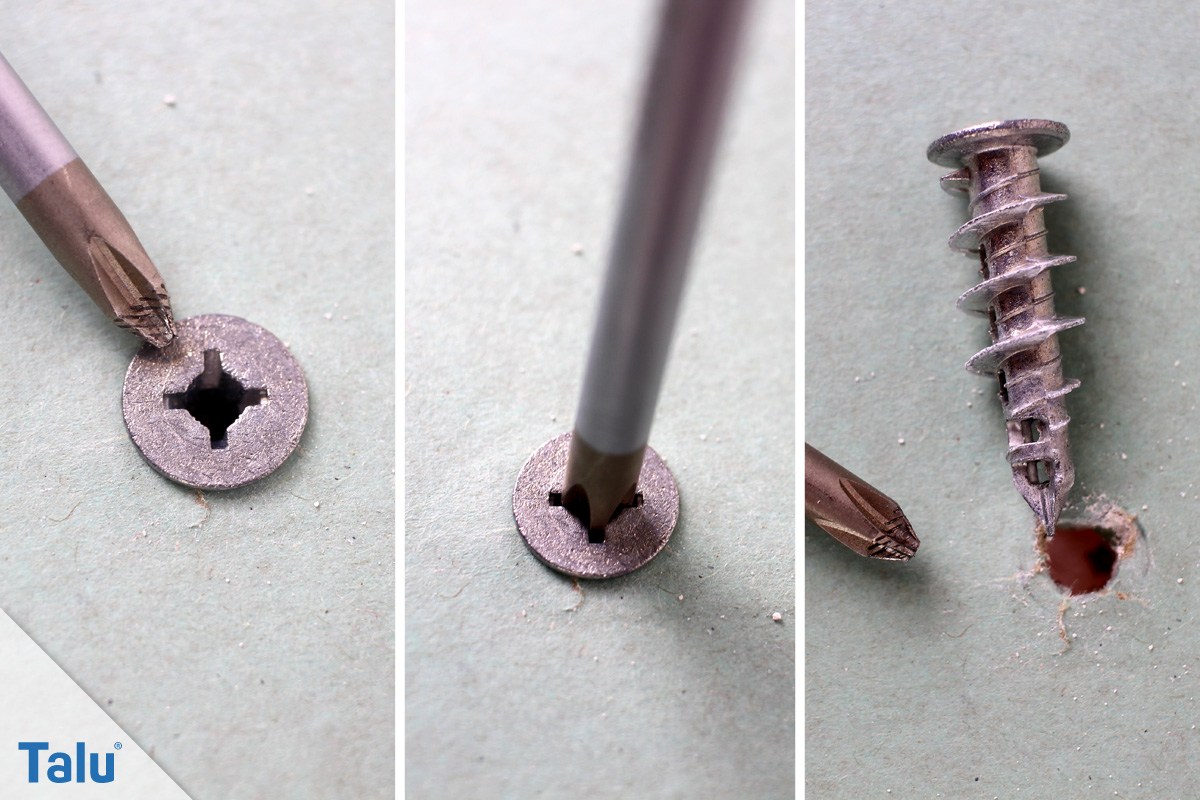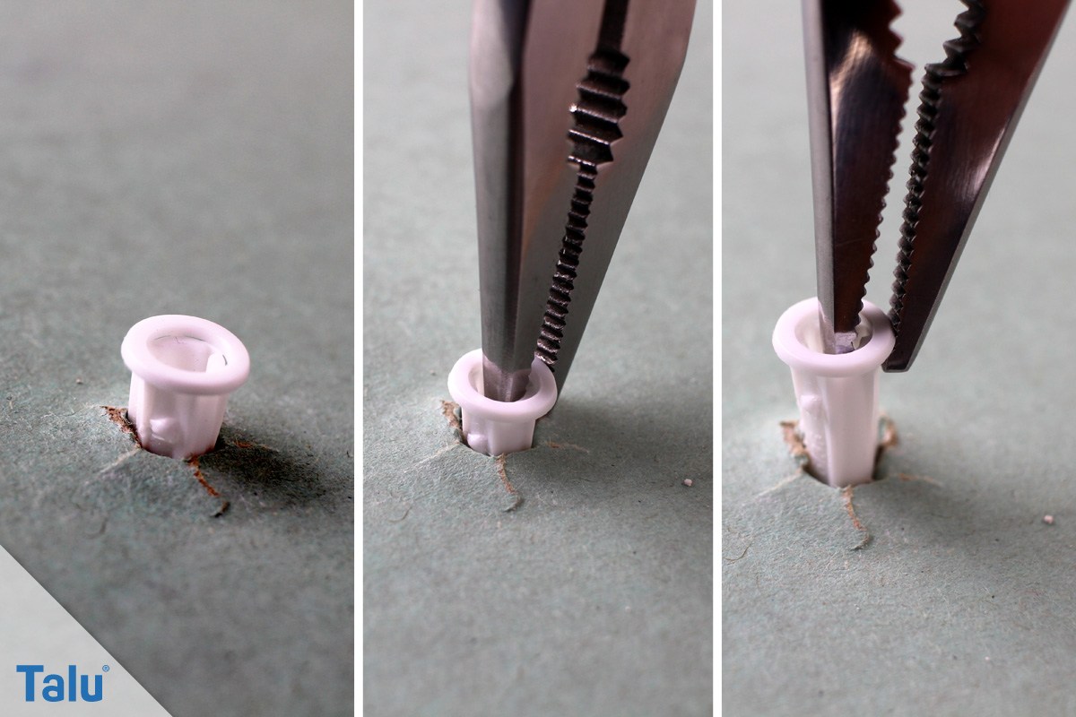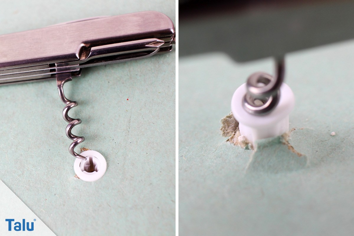 Sie drehen einen Korkenzieher, bis er fasst, in das Dübelloch und ziehen dann vorsichtig den Dübel heraus. Wenn es nicht beim ersten Versuch gelingt, drehen Sie den Korkenzieher etwas tiefer in den Dübel hinein.