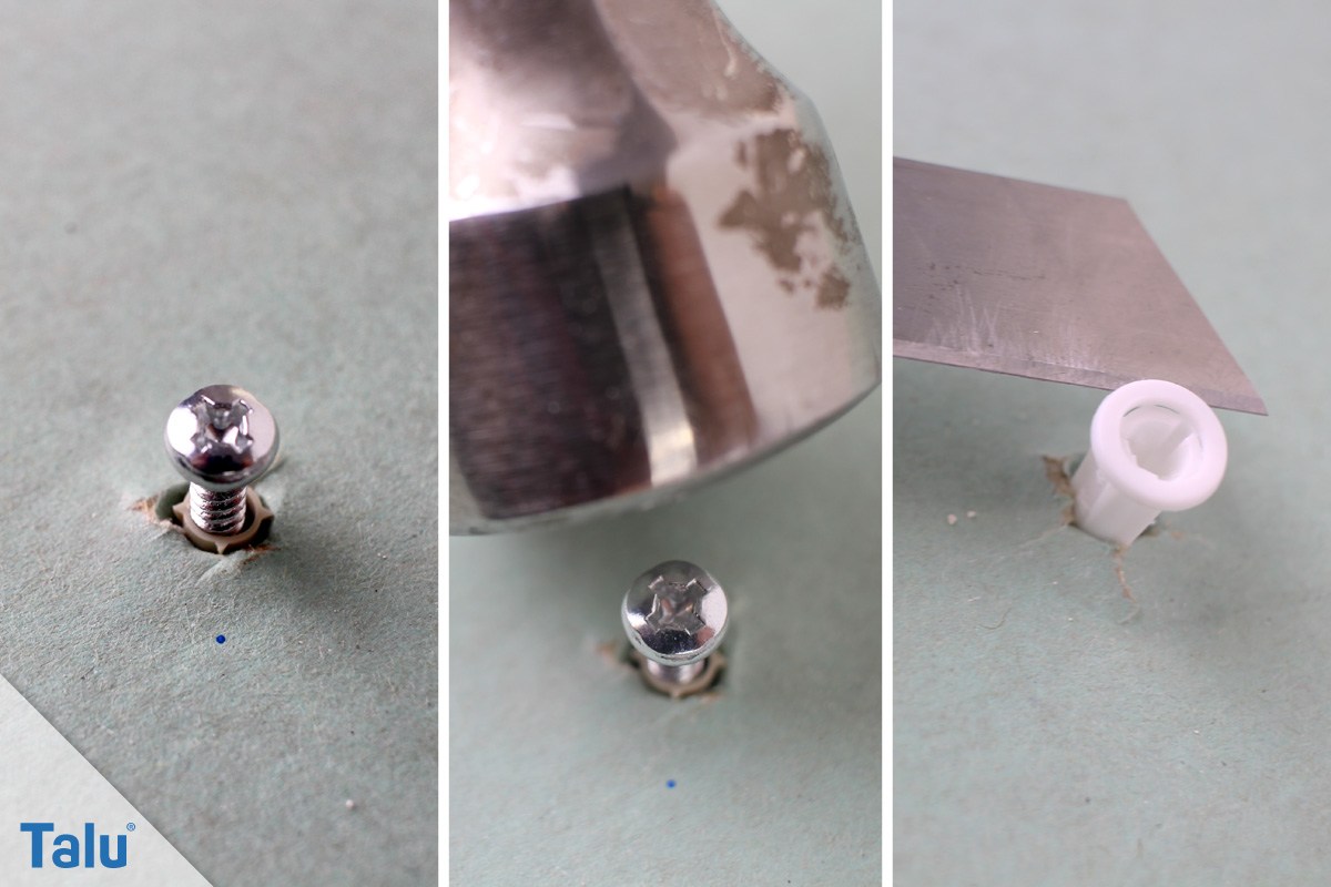 Dies ist sicher nicht die edelste Methode, aber eignet sich besonders bei Gibskartonwänden (und andere Hohlraumlösungen) und Dübel ohne breitem Rand. Wenn der Dübel einen breiten Rand hat, lässt sich dieser mit der Hilfe eines Cuttermesser oder der Klinge eines Teppichmessers vorsichtig abschneiden. Machen Sie dies aber bitte sehr vorsichtig, sonst richten Sie einen größeren Schaden an der Wand und Ihren Fingern an, als Ihnen lieb ist.