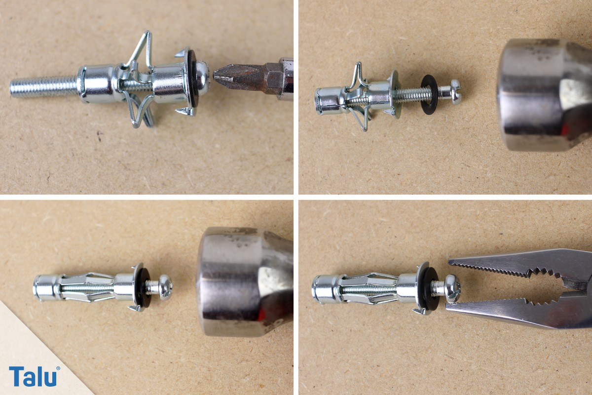 Hohlraumdübel aus Metall haben die Eigenschaft, dass sie sich im Hohlraum aufspannen – wie ein Regenschirm. Um diese Verkeilung wieder zu lösen müssen Sie die Schraube so in den Dübel drehen dass die Schraube hinten im Gewinde fasst. Jetzt hält die Schraube sich im hinteren Teil vom Dübel fest und schaut vorn noch ein ganzes Stück heraus.