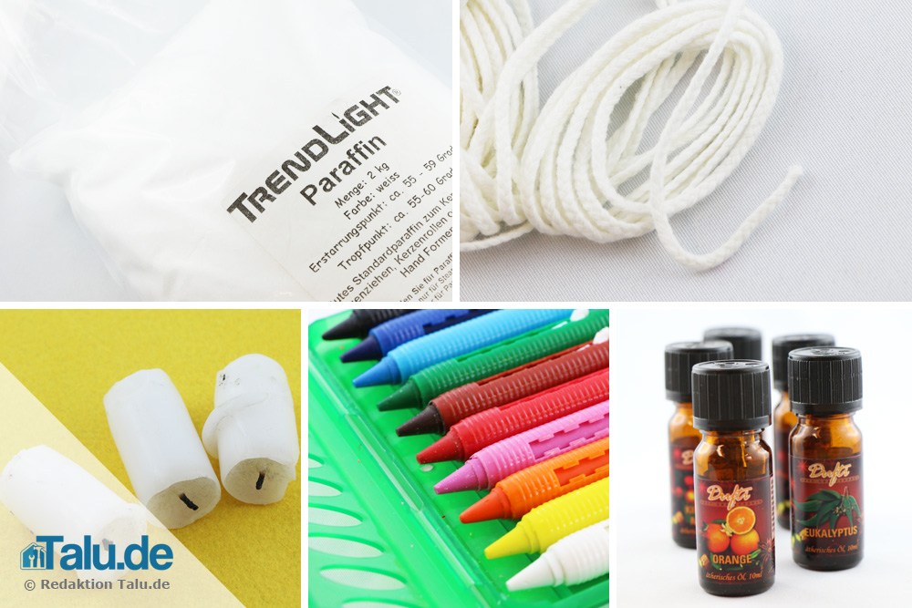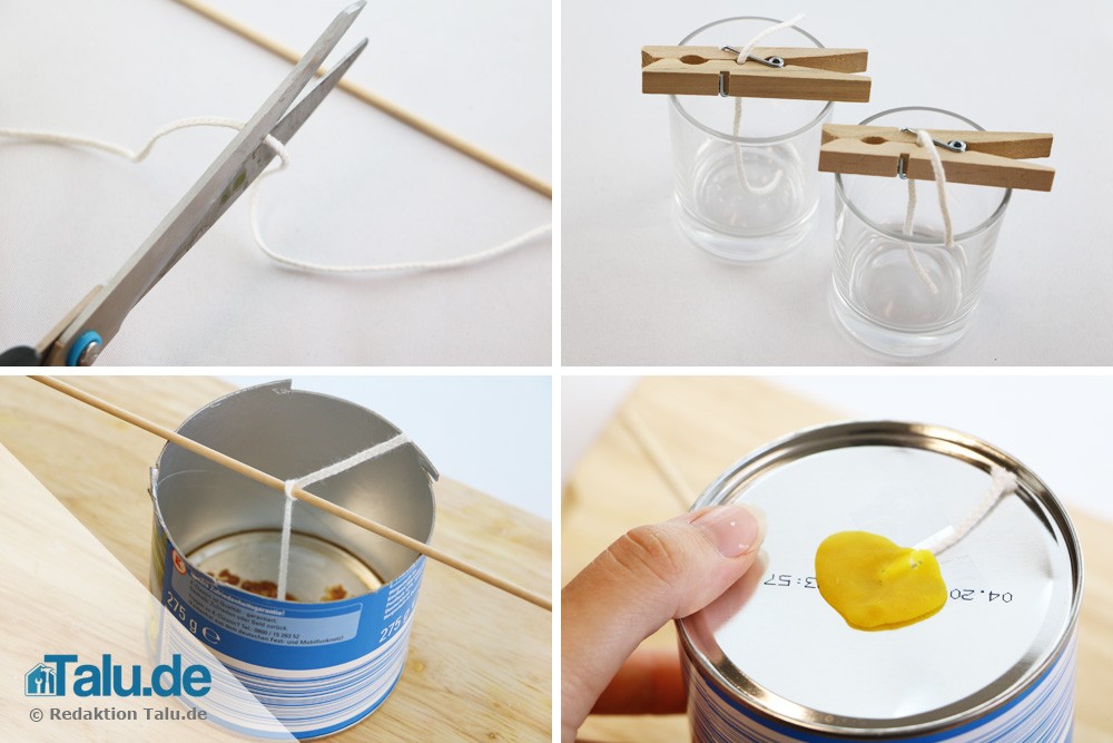 Sie können zum Beispiel einen alten Getränkekarton auf die gewünschte Kerzenhöhe kürzen – für den Docht pieksen Sie mit einer Nadel ein Loch in den Boden. Dieser wird dort hindurch gezogen und oben mittig an einen Holzspieß gebunden. Der Spieß hält den Docht im flüssigen Wachs in der Mitte. Ein kleiner Klumpen Wachs kann das Loch gut verschließen, sodass beim Kerzengießen nichts herausfließen kann.