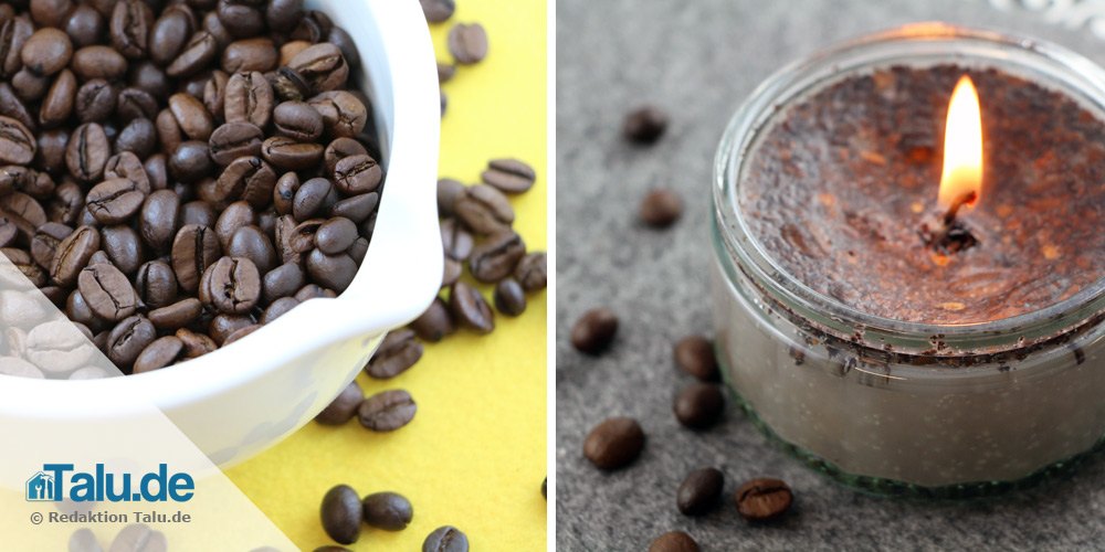 Für diejenigen, die es etwas herber mögen, ist die Duftkerze mit Kaffeeduft eine passende Variante. Mörsern Sie Kaffeebohnen klein und geben Sie diese anschließend in das heiße Wachs. Durch die Hitze werden die Kaffeearomen freigesetzt. Gießen Sie im Anschluss das Wachs in die Form und ergänzen Sie dann noch einzelne, ganze Bohnen auf der Wachsoberfläche – fertig ist die DIY-Duftkerze für Genießer!