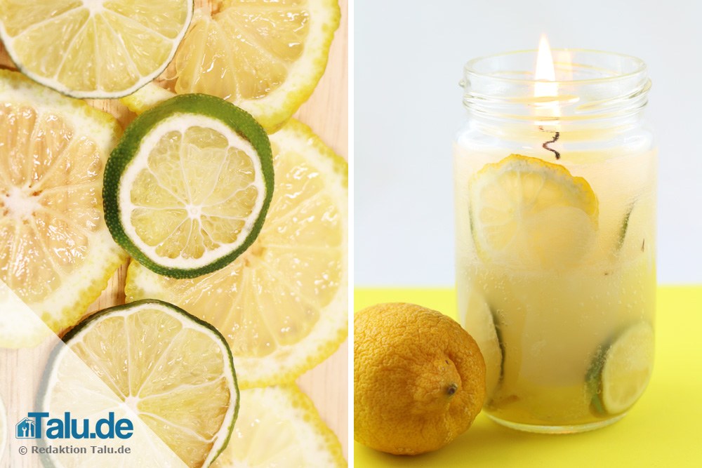 Eine für den Sommer und gegen Mücke helfende Duftkerzenvariante ist die Cintronella-Kerze. Dieses Öl in der Kerze hält Ihnen an manchen Sommerabenden alle Mücken vom Leib. Eine ähnlich duftende Kerze machen Sie mit ausgepressten Limetten und Zitronen. Die getrockneten Scheiben der Limette und Zitrone geben Sie einfach in das Glas.