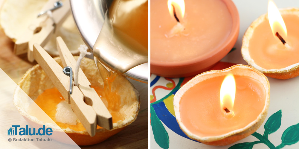 Diese Idee wird Sie begeistern – nehmen Sie getrocknete Orangenschalen und gießen Sie doch einfach da Wachs hinein. Dafür wird mit Orangenöl aromatisiertes Wachs einfach in die trockene Schale gegossen. Vorher wird der Docht durch ein kleines Loch in der Mitte gezogen. Befestigen Sie den Docht innen mit etwas Wachs und verschließen Sie so gleich das Loch, das kein Wachs hinausfließen kann. Eine Klammer fixiert den Docht in der Mitte. Und Schon ist diese sowohl für den Winter, als auch den Sommer geeignete Duftkerze fertig.