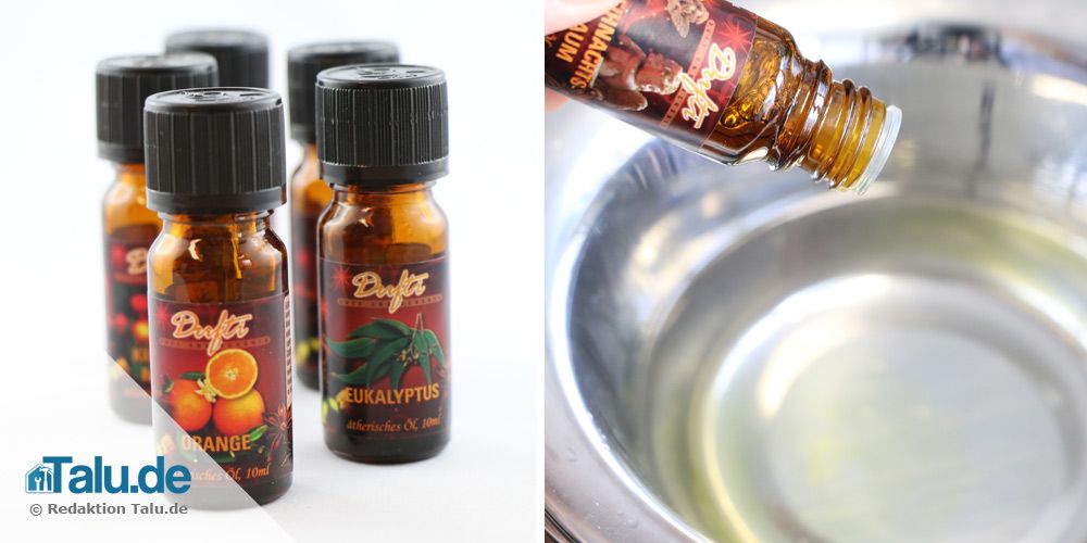Die einfachste und schnellste Variante ist das Arbeiten mit ätherischen Ölen. In vielen ausgewählten Dekorations-, Drogerie- und Hobbyläden finden Sie bereits eine kleine Auswahl an ätherischen Ölen. Diese können Sie bereits für weniger als 2 € kaufen. Für einen speziellen Wunsch lassen sich online aber jede Menge verschiedener Düfte finden. Ein paar Tropfen der kleinen Fläschchen genügen, um das Wachs zu parfümieren. Beliebte und gut erhältliche Duftnuancen sind: