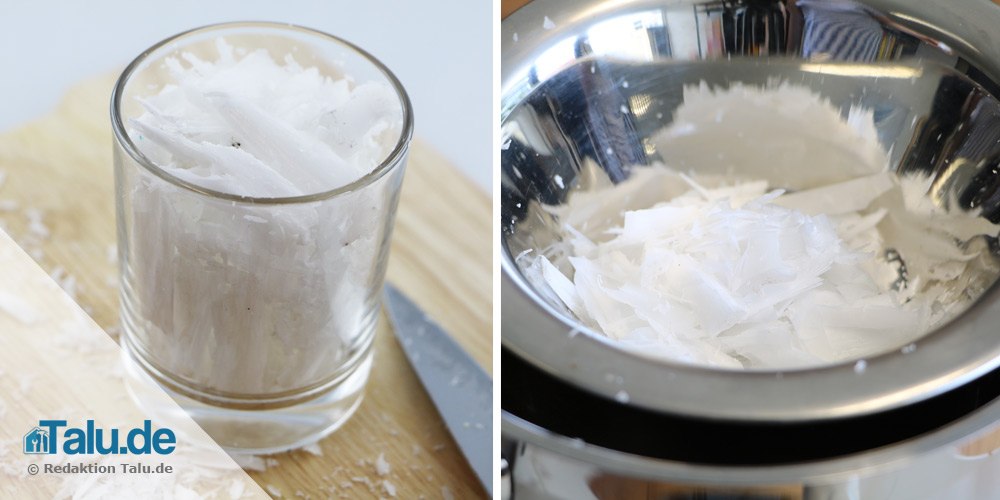 Zu Beginn sortieren und zerkleinern Sie die Wachsreste, die Sie in der Duftkerze verarbeiten möchten. Dabei sollten Unreinheiten und abgebrannte Dochtreste restlos entfern werden, damit Sie später keine Krümel oder Rückstände in der Kerze haben. Wachsgranulat ist bereits zerkleinertes Wachs, welches Sie in ausgewählten Bastel- und Hobbyläden kaufen können.