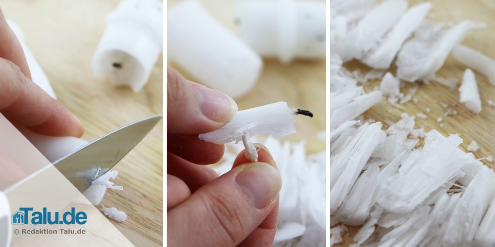 Ist das Wachs vollständig getrocknet, kann die Kerze verwendet werden. Haben Sie dann die Kerze in eine Pappform gegossen, kann die Pappe kinderleicht abgelöst und im Notfall auch zerschnitten werden. Gelingt Ihnen das Lösen der Kerze nicht, kann ein kleiner Aufenthalt im Kühlschrank die Lösung sein. Durch die Kälte zieht sich das Wachs zusammen – die Form kann dann einfacher gelöst werden.