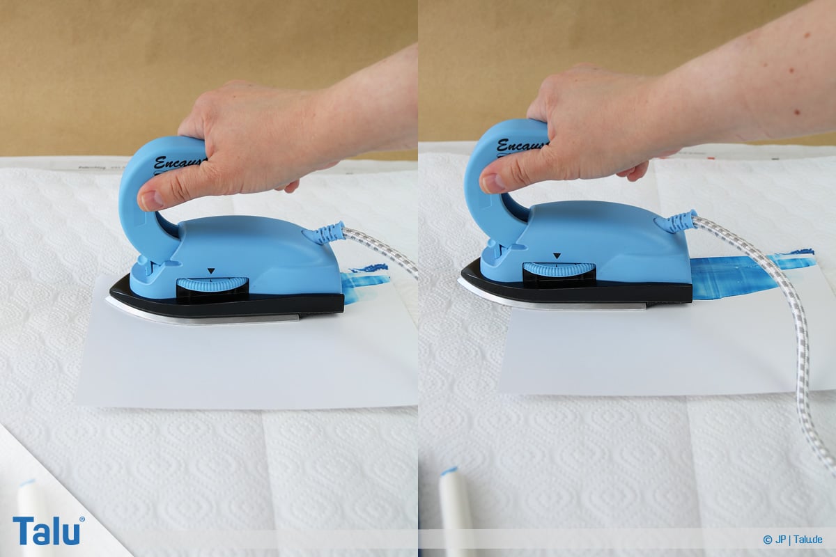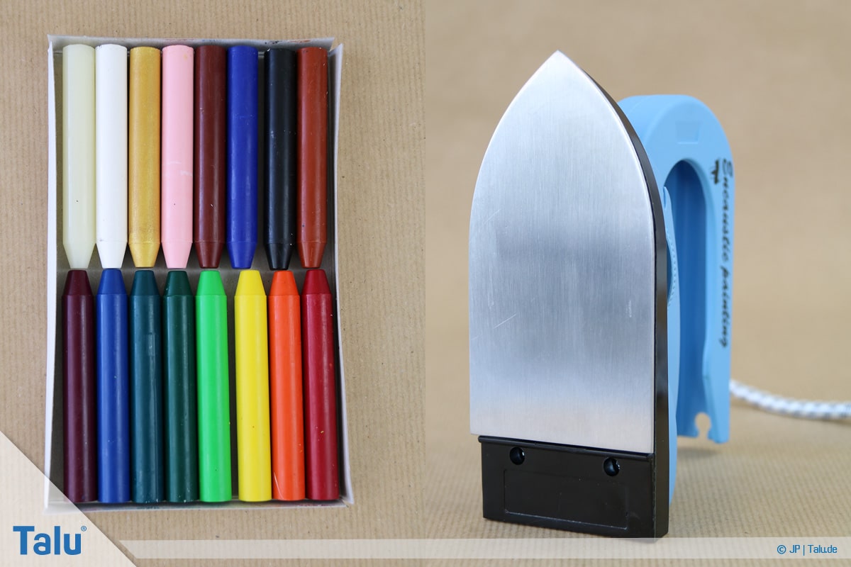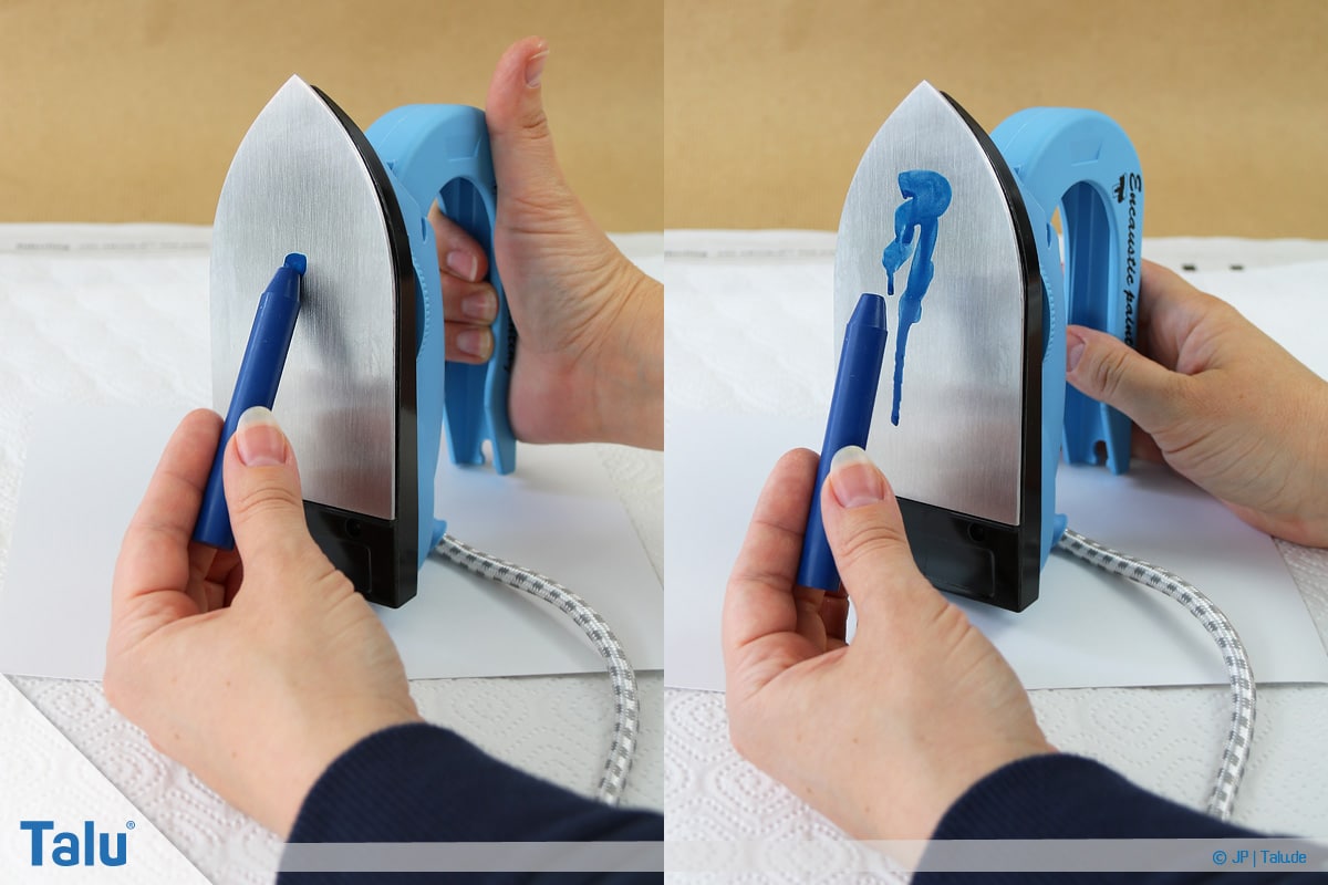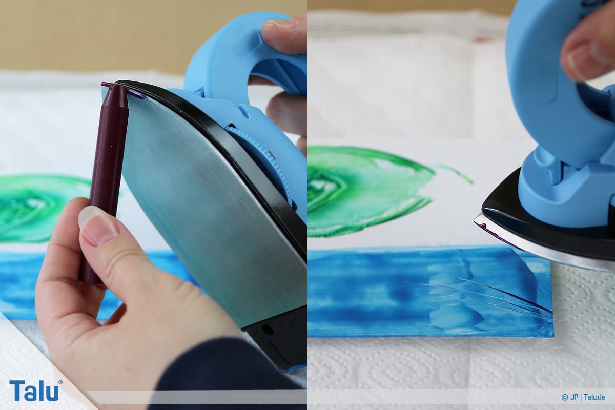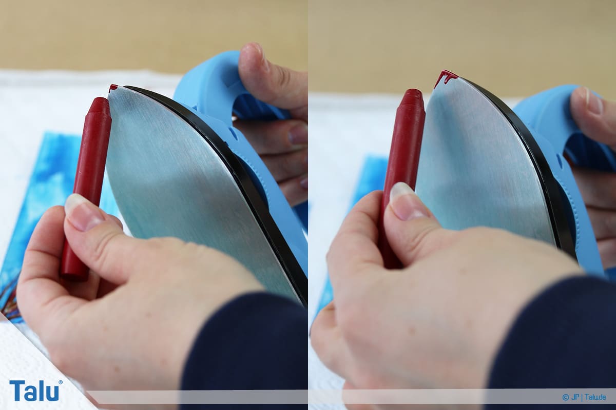 5. Schritt: Tragen Sie eine beliebige Wachsfarbe auf die Eisenfläche auf (einfach drübermalen). In Sekundenschnelle schmilzt das Wachs durch die Hitzezufuhr.