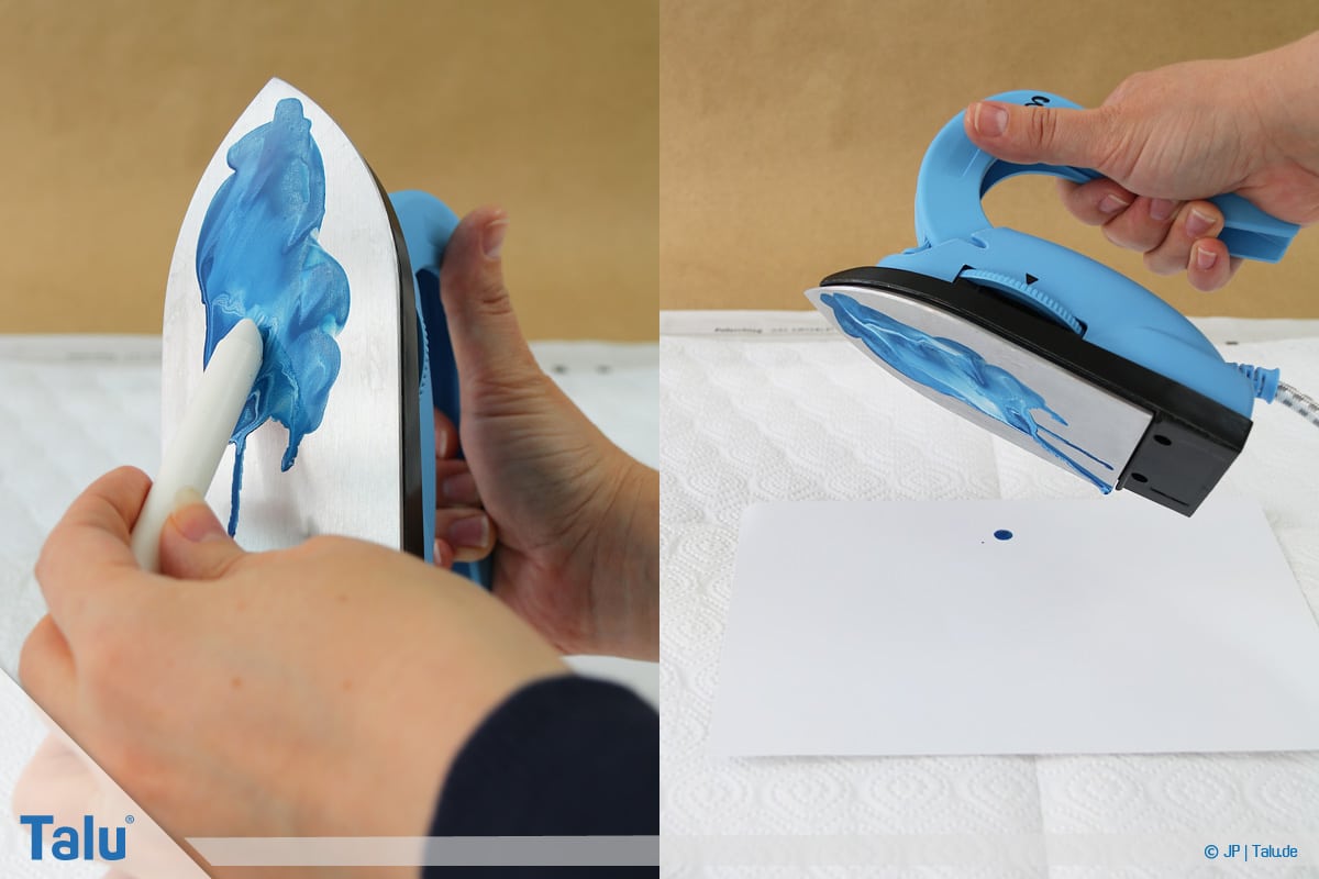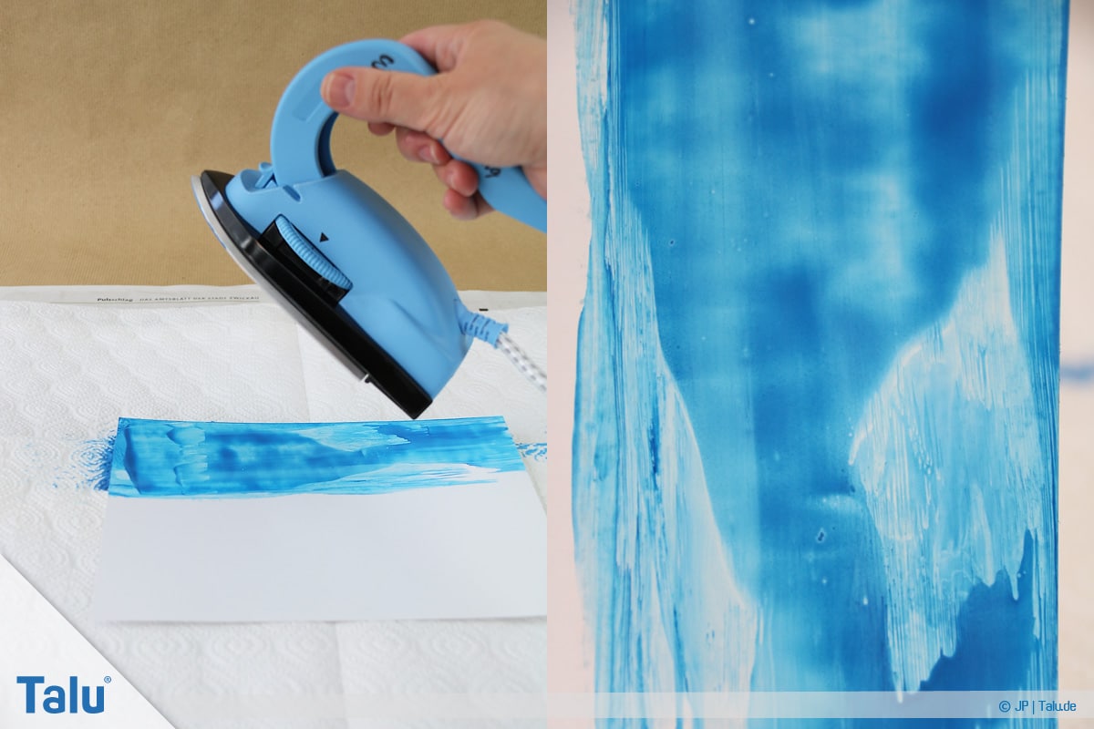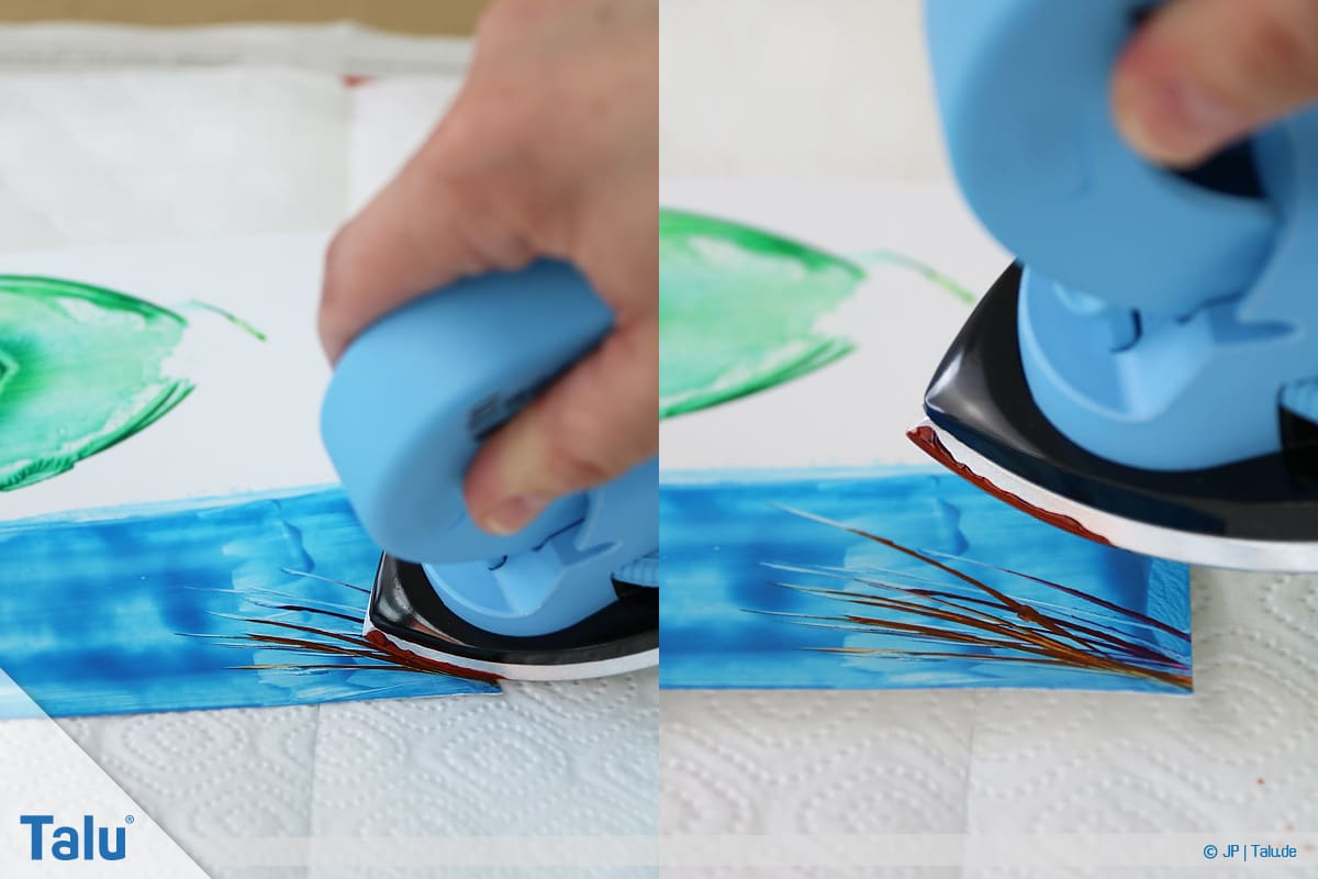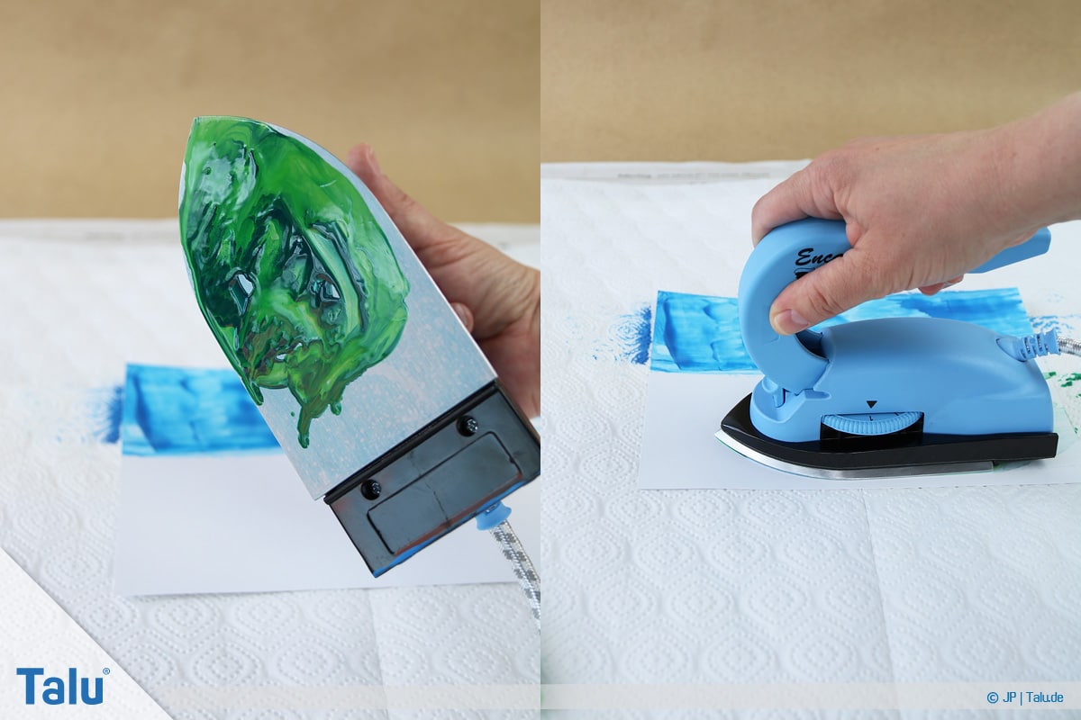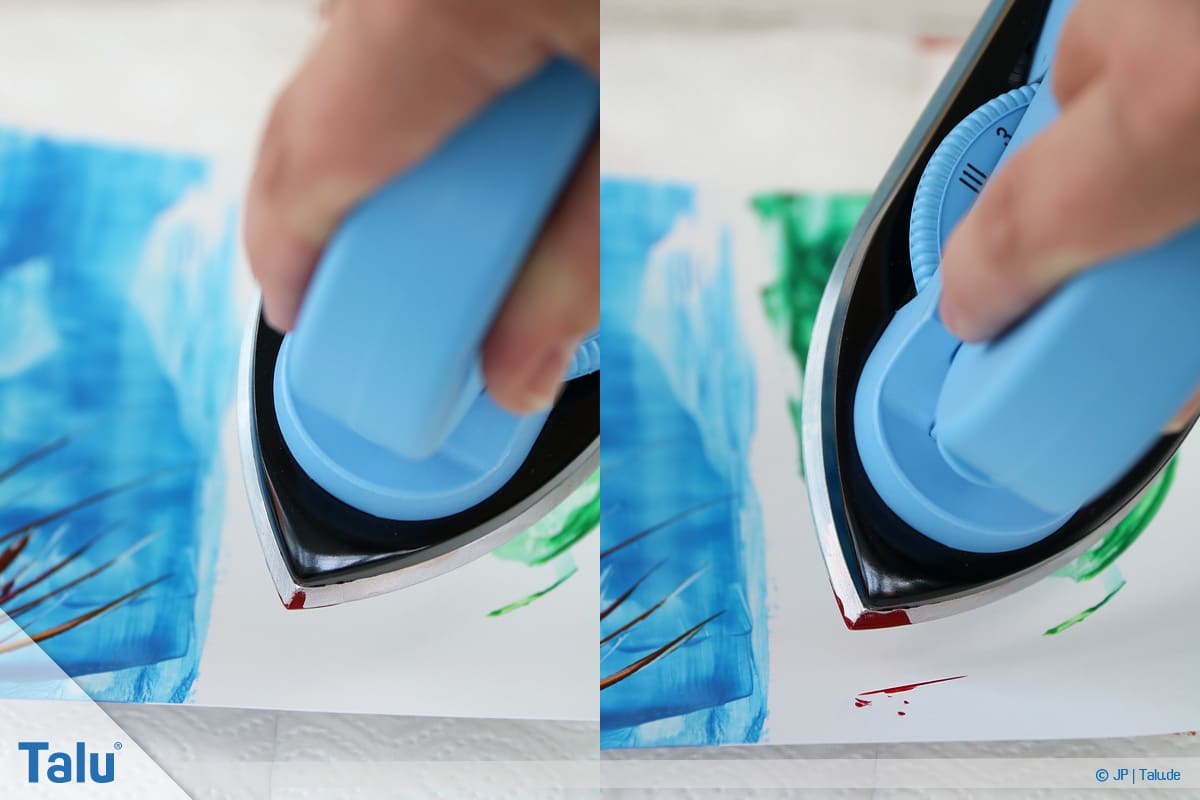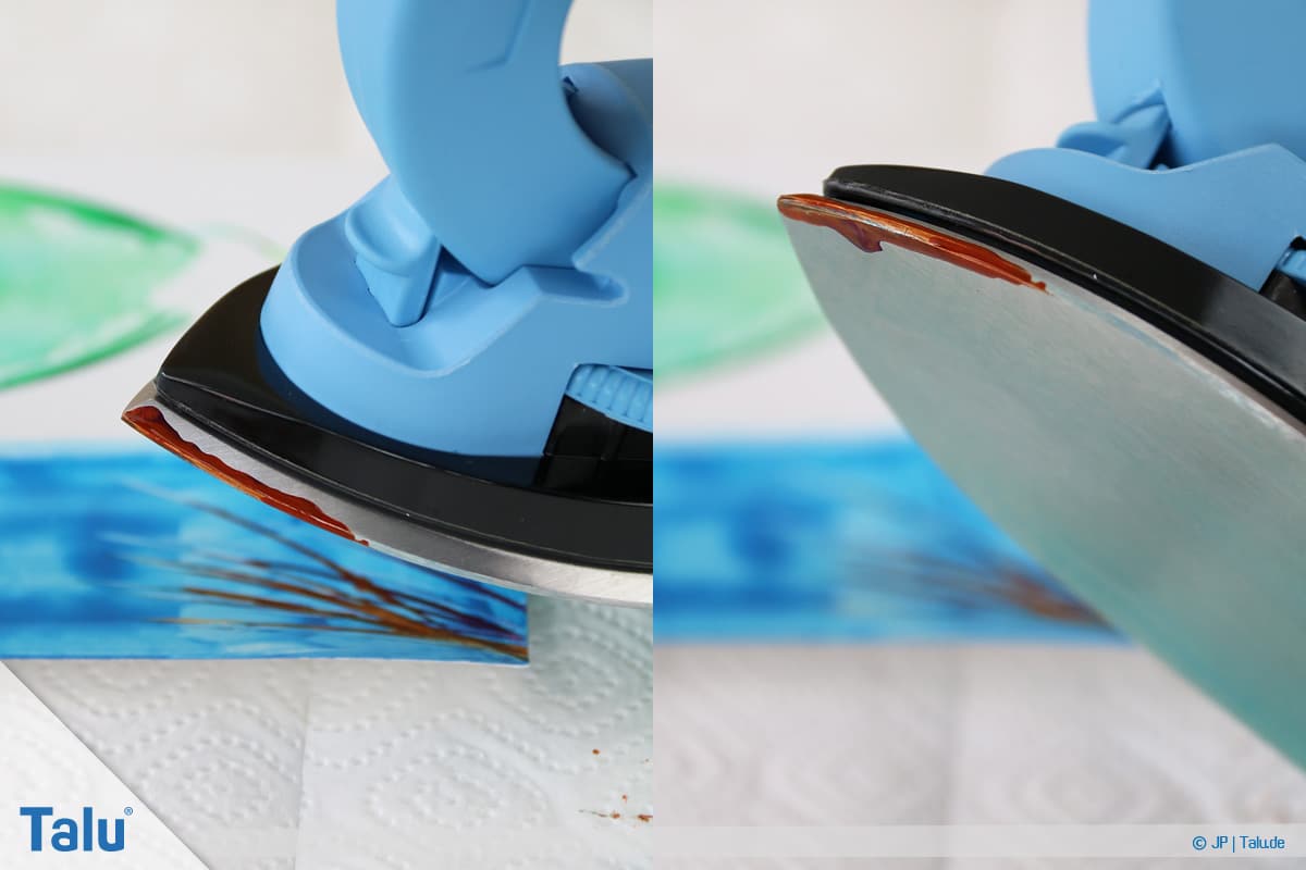 5. Schritt: Tragen Sie eine beliebige Wachsfarbe auf die Eisenfläche auf (einfach drübermalen). In Sekundenschnelle schmilzt das Wachs durch die Hitzezufuhr.