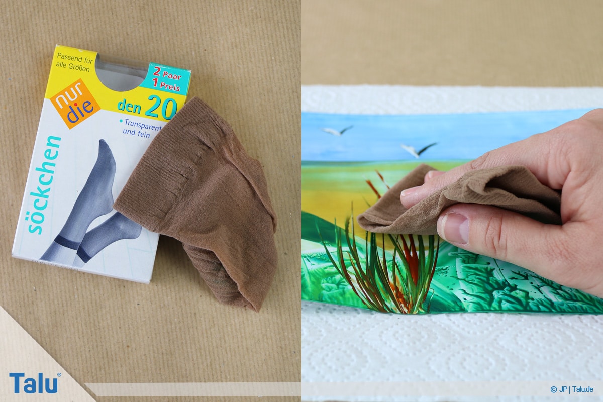5. Schritt: Reißen Sie vom Küchenpapier drei bis vier Blatt ab und legen Sie das Bündel neben sich hin. Das Papier dient dazu, das Maleisen immer wieder abzuwischen, bevor Sie eine neue Farbe verwenden.