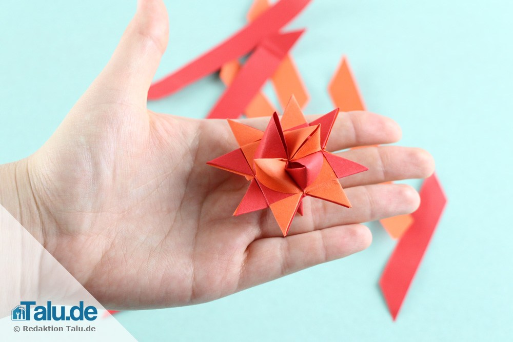 Schritt 20: Mit den anderen Streifen wiederholen Sie Schritt 19 noch drei Mal. Wer den Stern auf ein Geschenk kleben will, ist nun fertig – einfach noch die überstehenden Reststücke mit der Schere abschneiden.