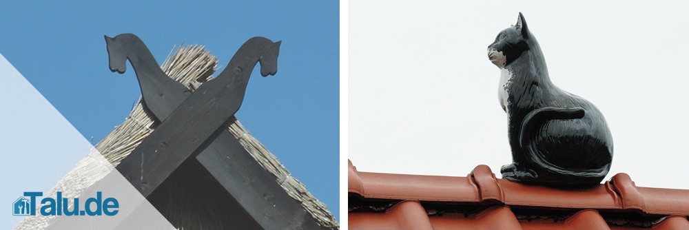 Momentan wieder im Kommen sind schützende Embleme, die als Glücksbringer vorne am Dachfirst/Giebel angebracht werden. Zum Beispiel Donnerbesen (bannen das Böse und schlechtes Wetter), der Hahn auf der Wetterfahne (bewacht das Haus) oder gekreuzte Pferdeköpfe (sollen Seuchen abwehren).