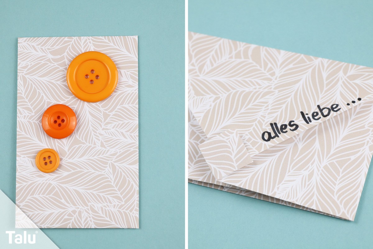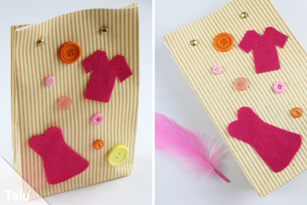 Schneiden Sie aus Papier oder Filz weibliche oder männliche Kleidungsstücke aus (je nachdem, ob der zu Beschenkende eine Frau oder ein Mann ist). Selbstverständlich können Sie diese vorab auf einem (separaten) Blatt Papier mit Bleistift vorzeichnen, ausschneiden und als Schablonen verwenden. Nehmen Sie dann eine einfache Papiertüte (am besten in einer schönen Farbe) zur Hand und kleben die hergestellten Kleidungsstücke darauf. Den Shopping-Gutschein oder das Geld stecken Sie in die Tüte.
