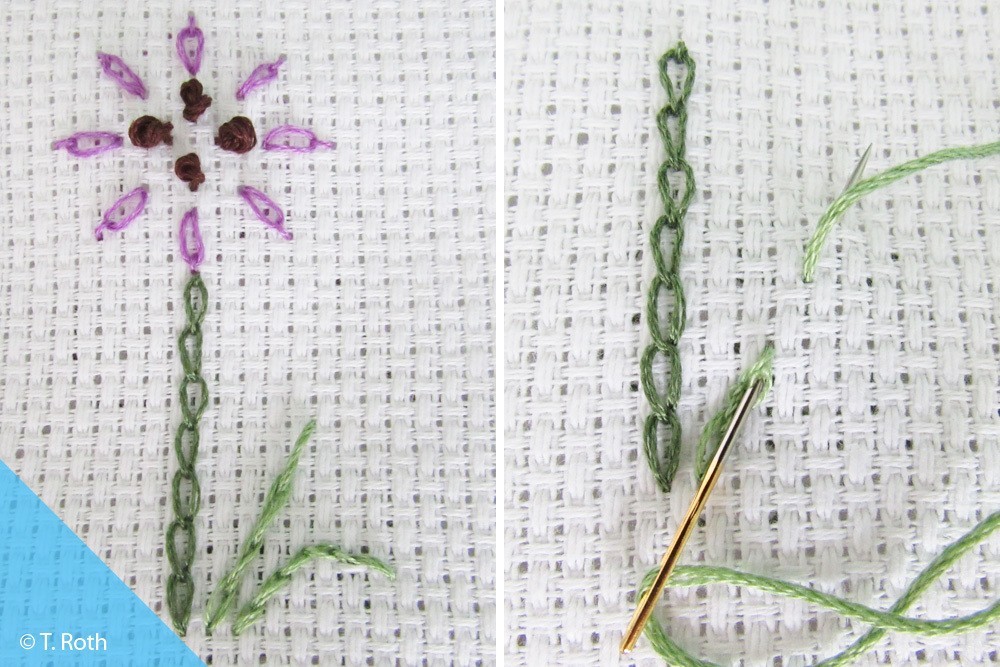 Der Schlingenstich wird auch Millefleurstich genannt, weil man damit die Blütenblätter einer Pflanze darstellen kann. Man geht dabei ...