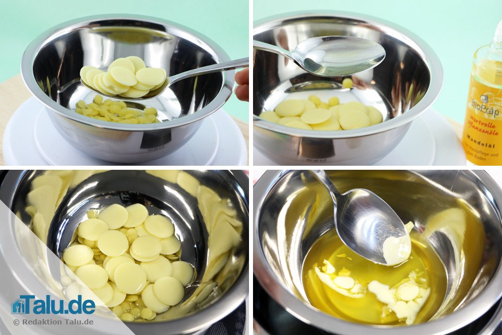 Geben Sie nun das Bienenwachs, die Kakaobutter und anschließend das Pflanzenöl in die Schüssel und rühren sie langsam um, bis alles geschmolzen ist.